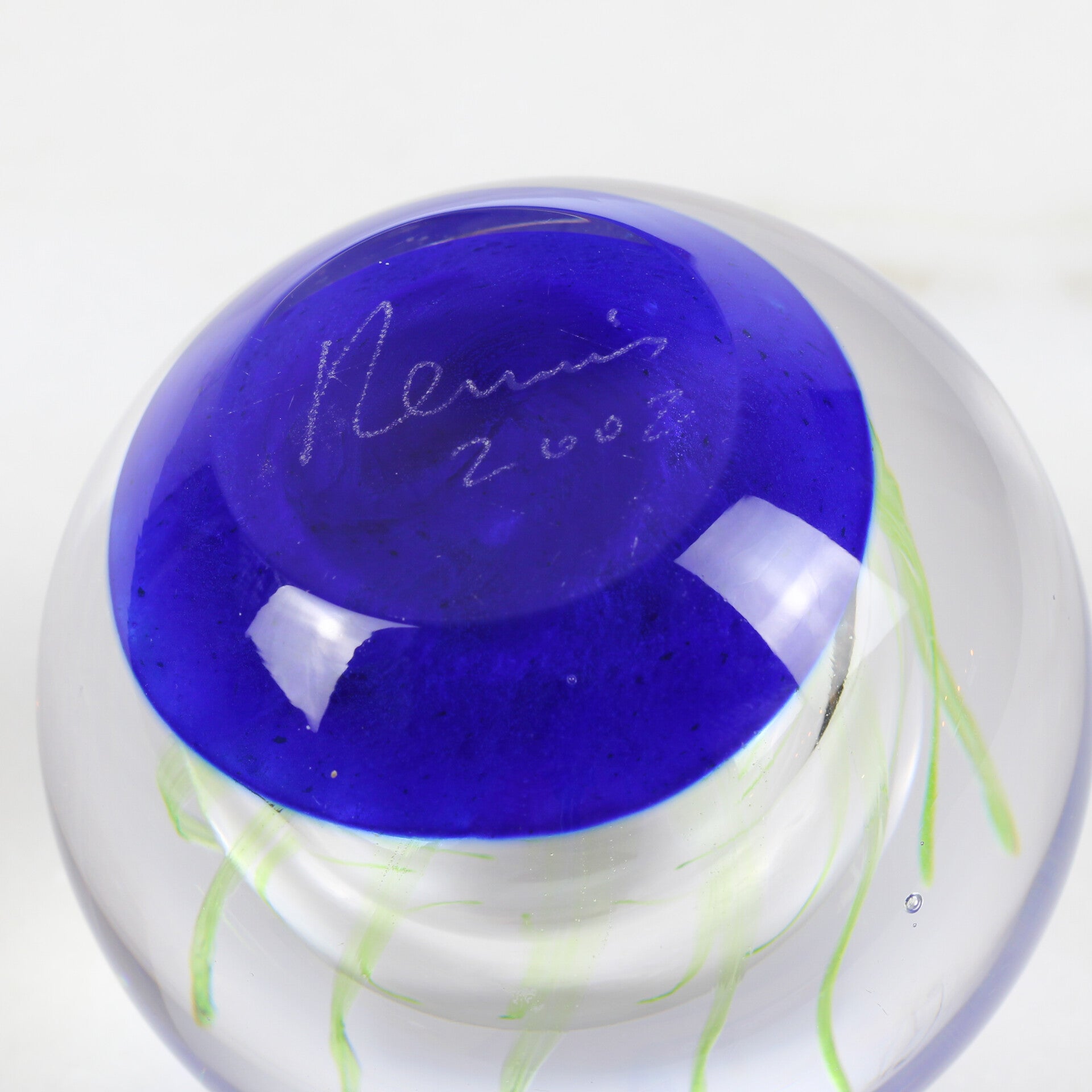 Mondgeblazen paperweightmet blauwe onderzijde en subtiele lichtgroene lijntjes en luchtbel in de bol.