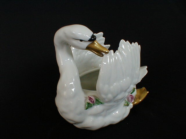 Dit is een vintage Dresden porseleinen zwaan-planter met 22K gouden rand,g emaakt van porselein.