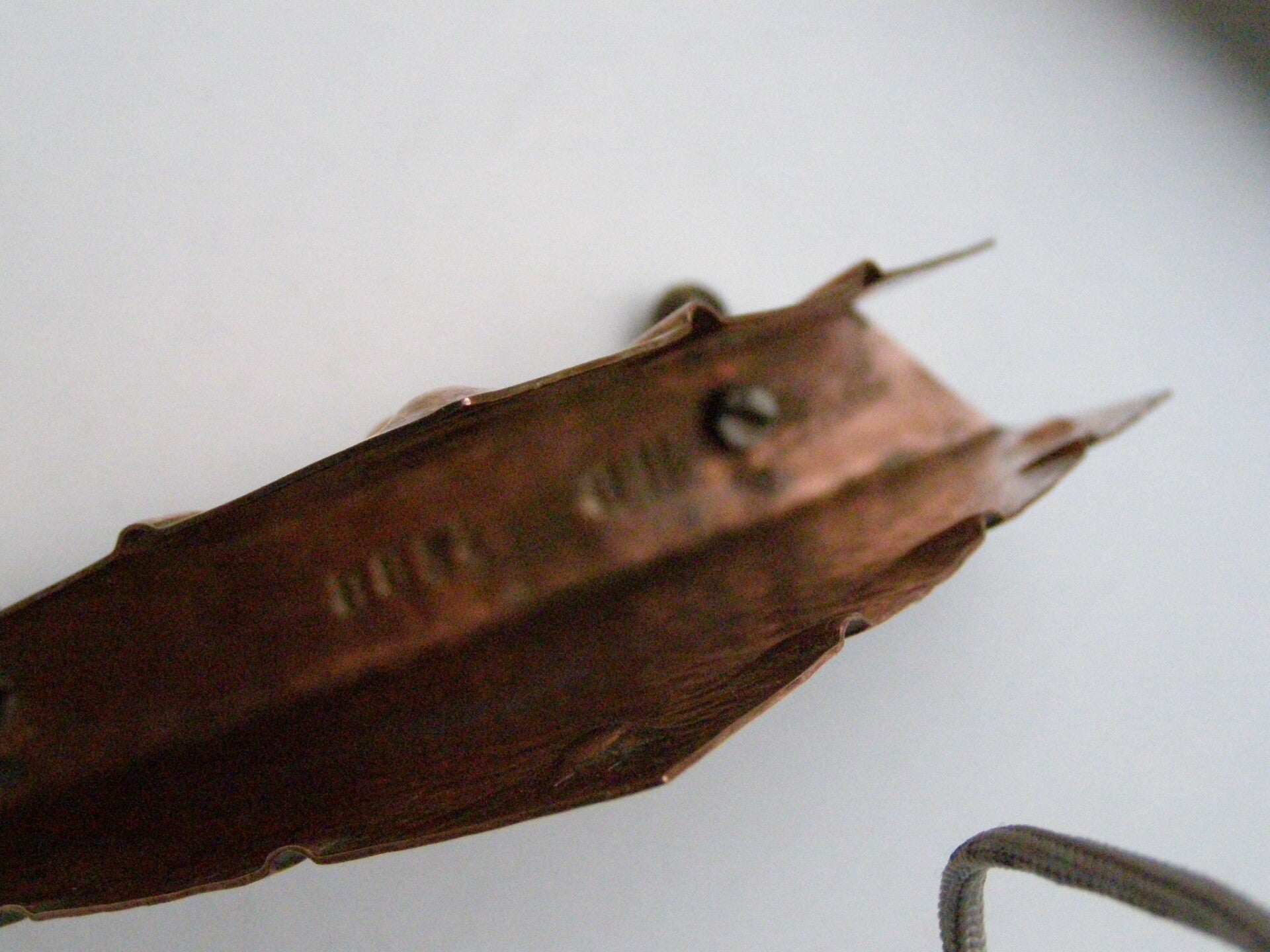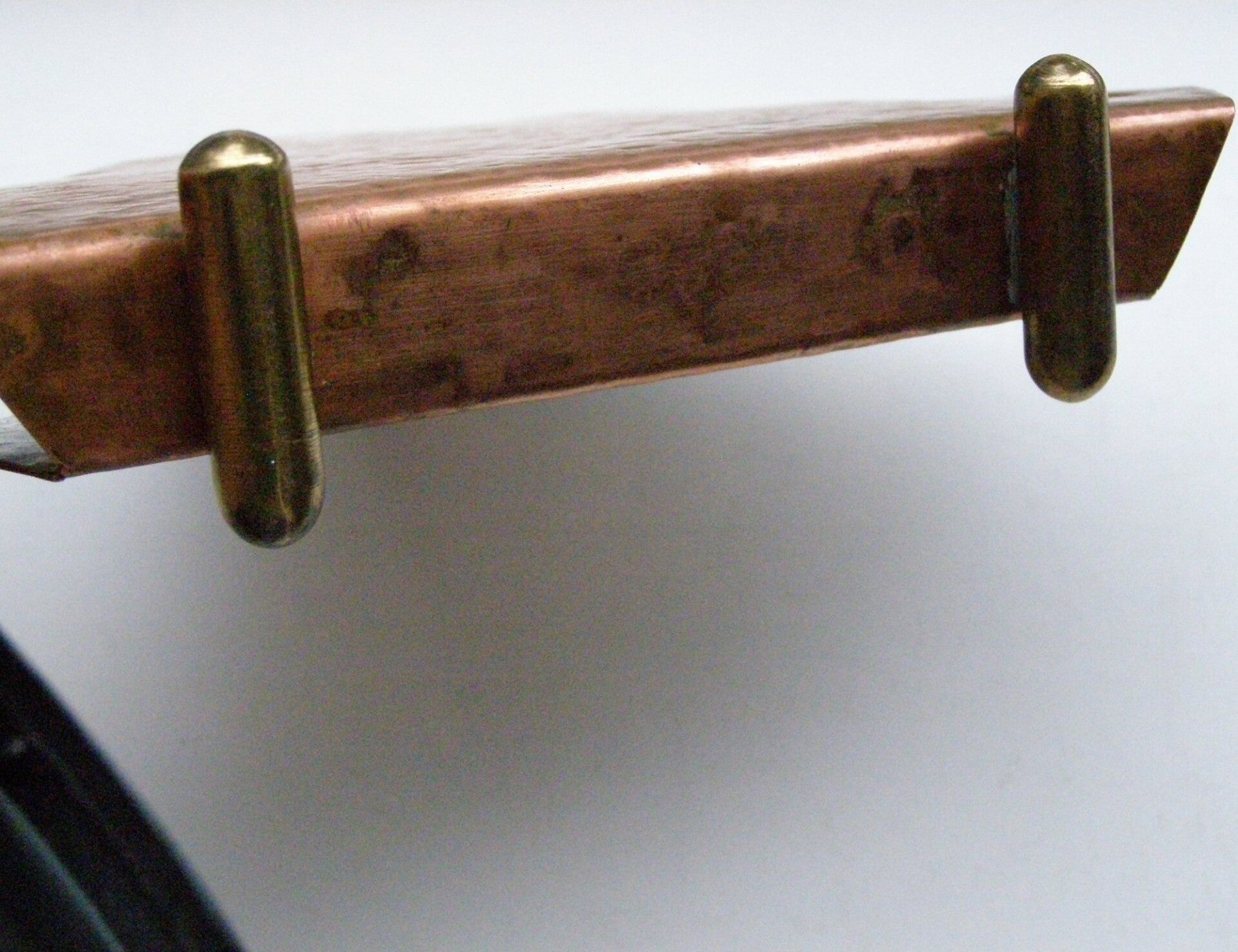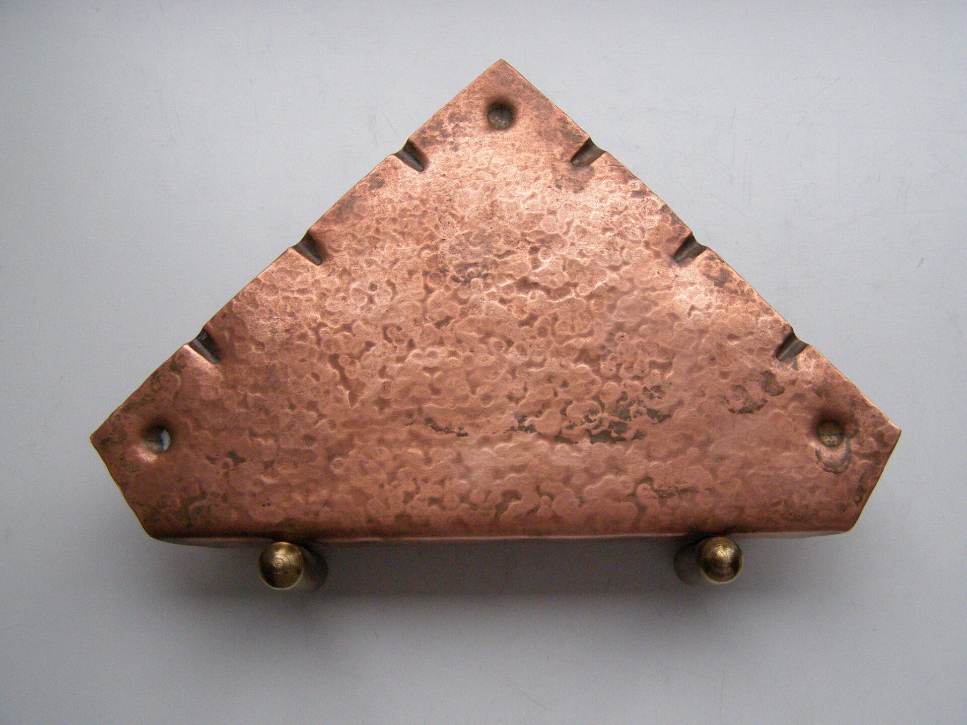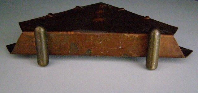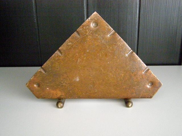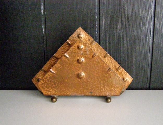 Amsterdamsche School brievenstandaard uit gehamerd roodkoper met geelkoperen (messing) voetjes.