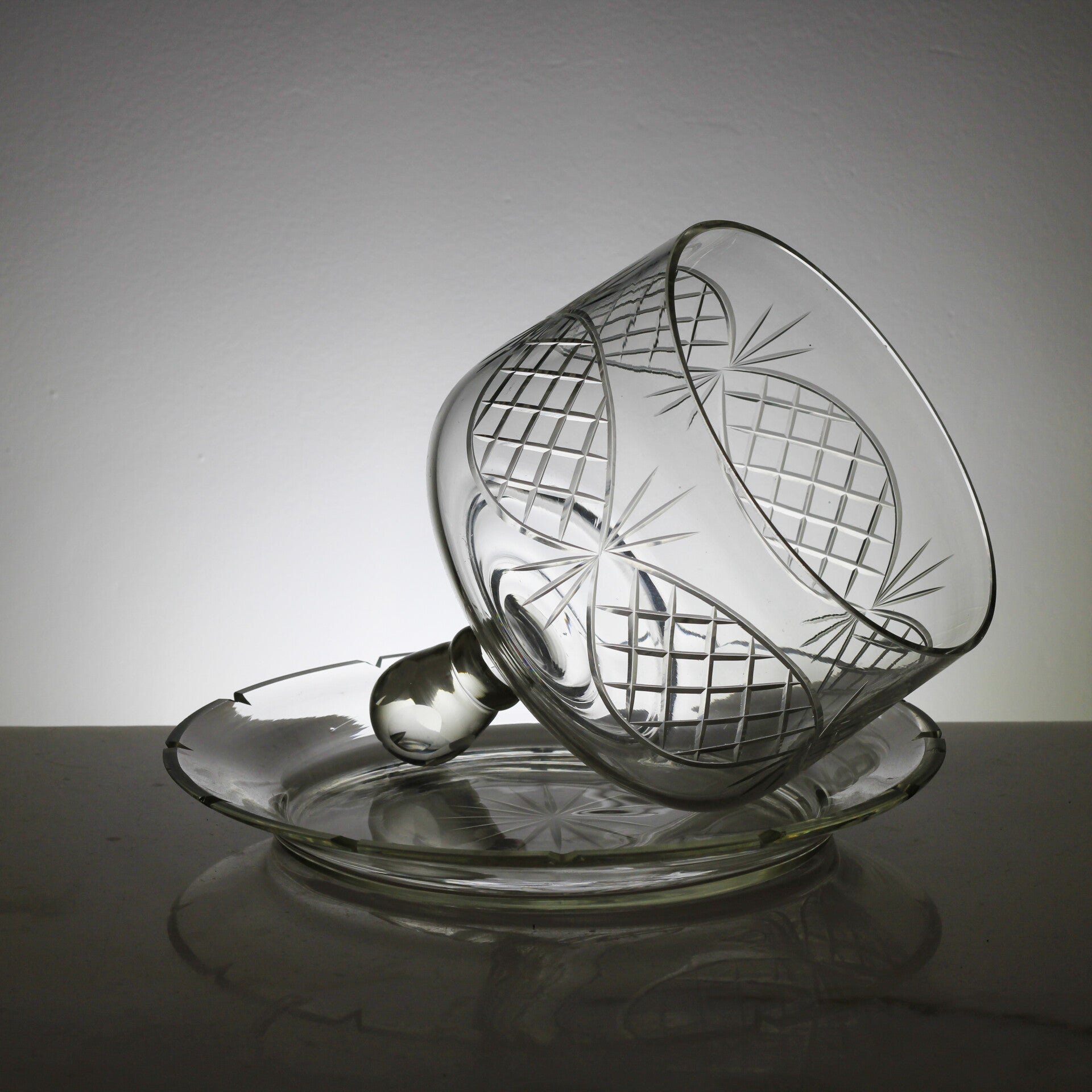 Art Deco geslepen glazen kaas- of boterstolp met een bijpassende onderschaal