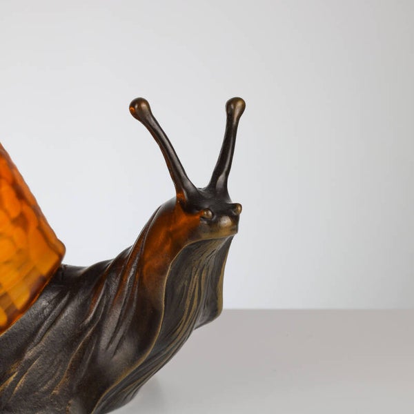 De slak bestaat uit een bronzen behuizing met een glazen body van gemarmerd oranje glas, wat zorgt voor een prachtig, veelzijdig licht en een unieke sfeer in het donker.