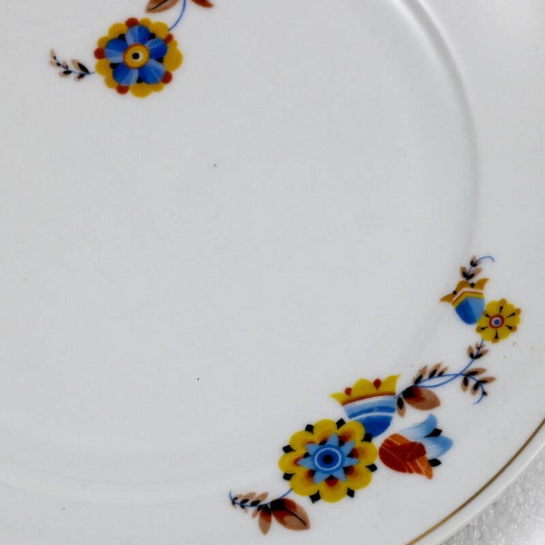 Een antieke porseleinen salade-/groenteschaal van Mosa Maastricht met een geel-blauw bloemmotief en een goudkleurige rand.