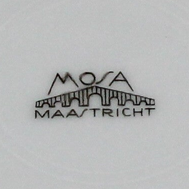 Een antieke porseleinen serveerschaal van Mosa Maastricht met een geel-blauw bloemmotief en een goudkleurige rand.