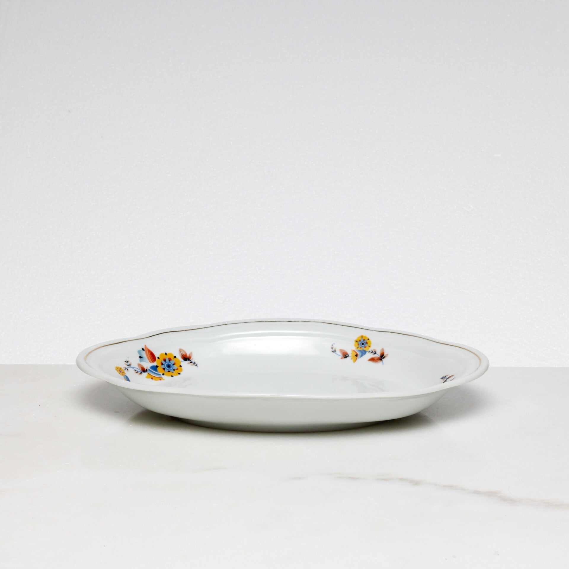 Mosa Maastricht ovale serveerschaal met een geel-blauw bloemmotief en een goudkleurige rand