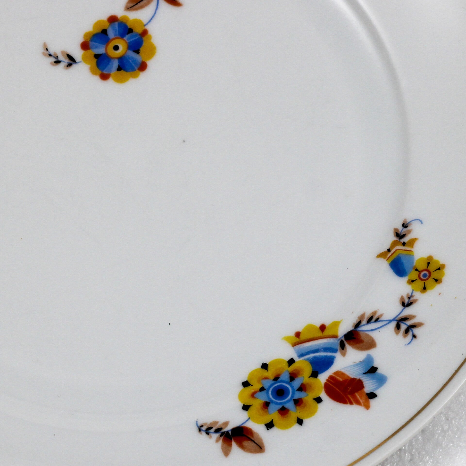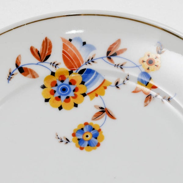 Een antiek porseleinen soepbord van Mosa Maastricht met een geel-blauw bloemmotief en een goudkleurige rand.