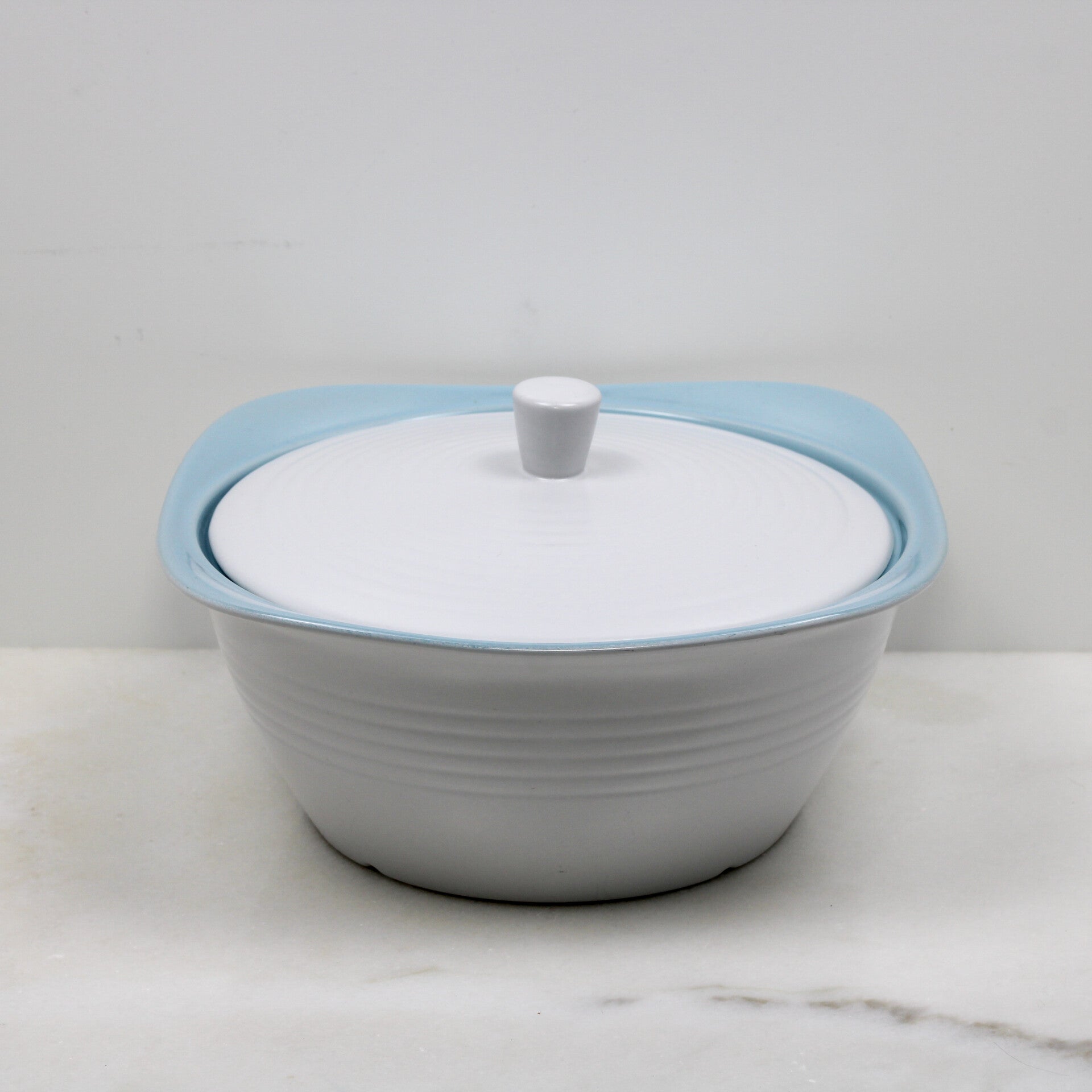 Een vintage ovenschaal uit het Cool Mist servies van Johnson Brothers.