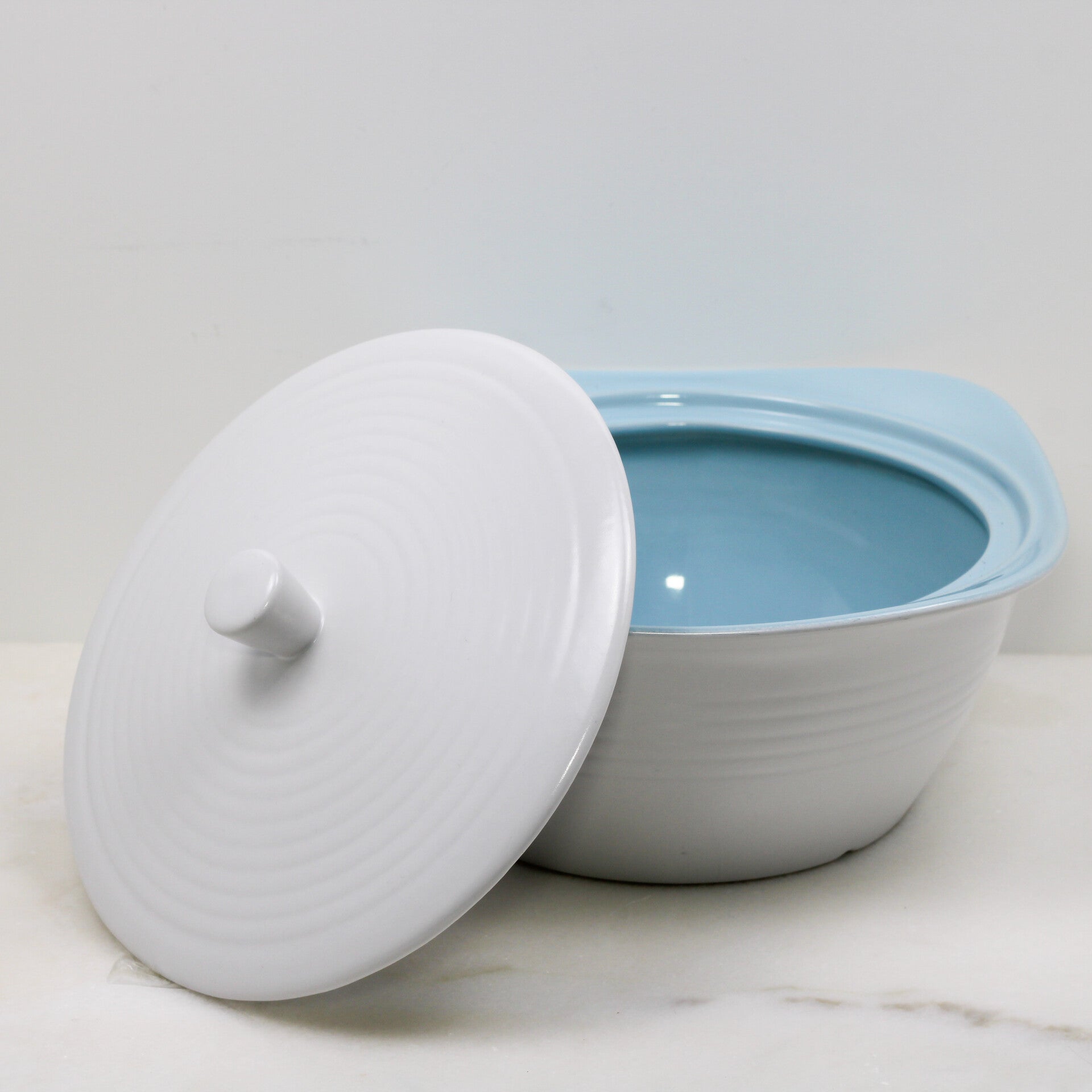 Het is gemaakt van aardewerk (stoneware) en heeft een opvallende combinatie van een geribbelde, witte buitenkant en een gladde, blauwe binnenkant.