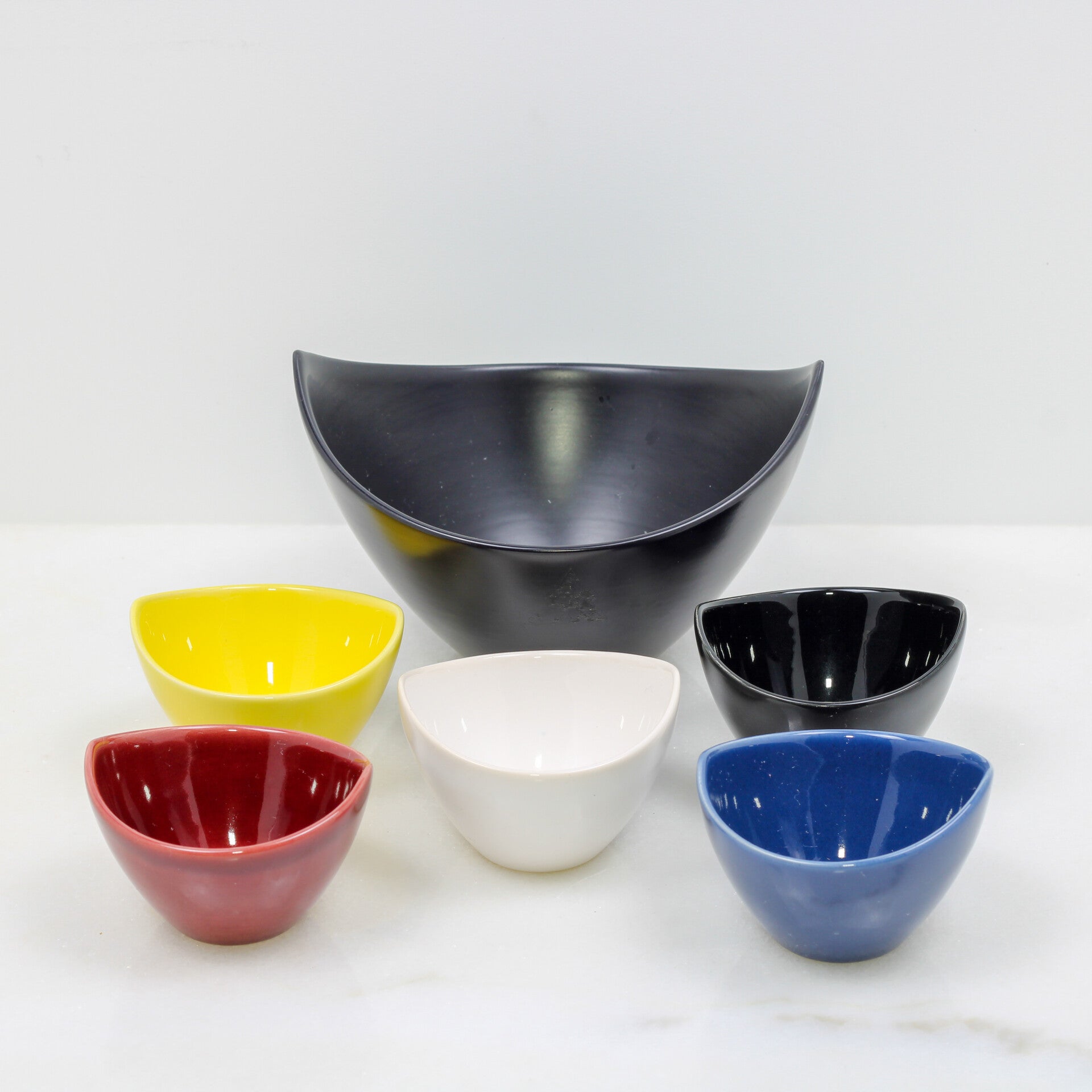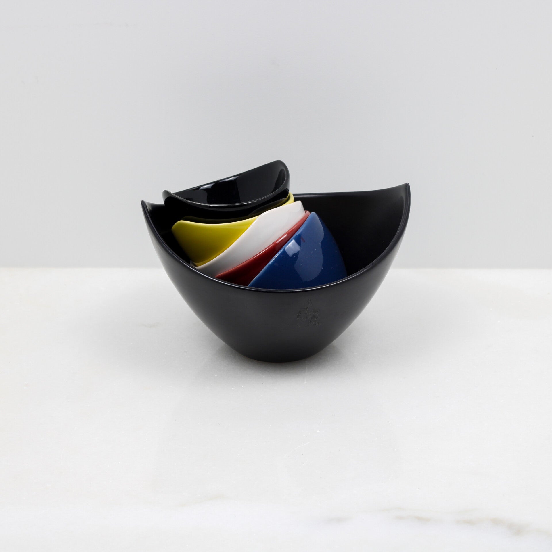 De set bestaat uit een grote matzwarte kom en vijf kleinere kommen in verschillende kleuren (rood, geel, wit, blauw en zwart).