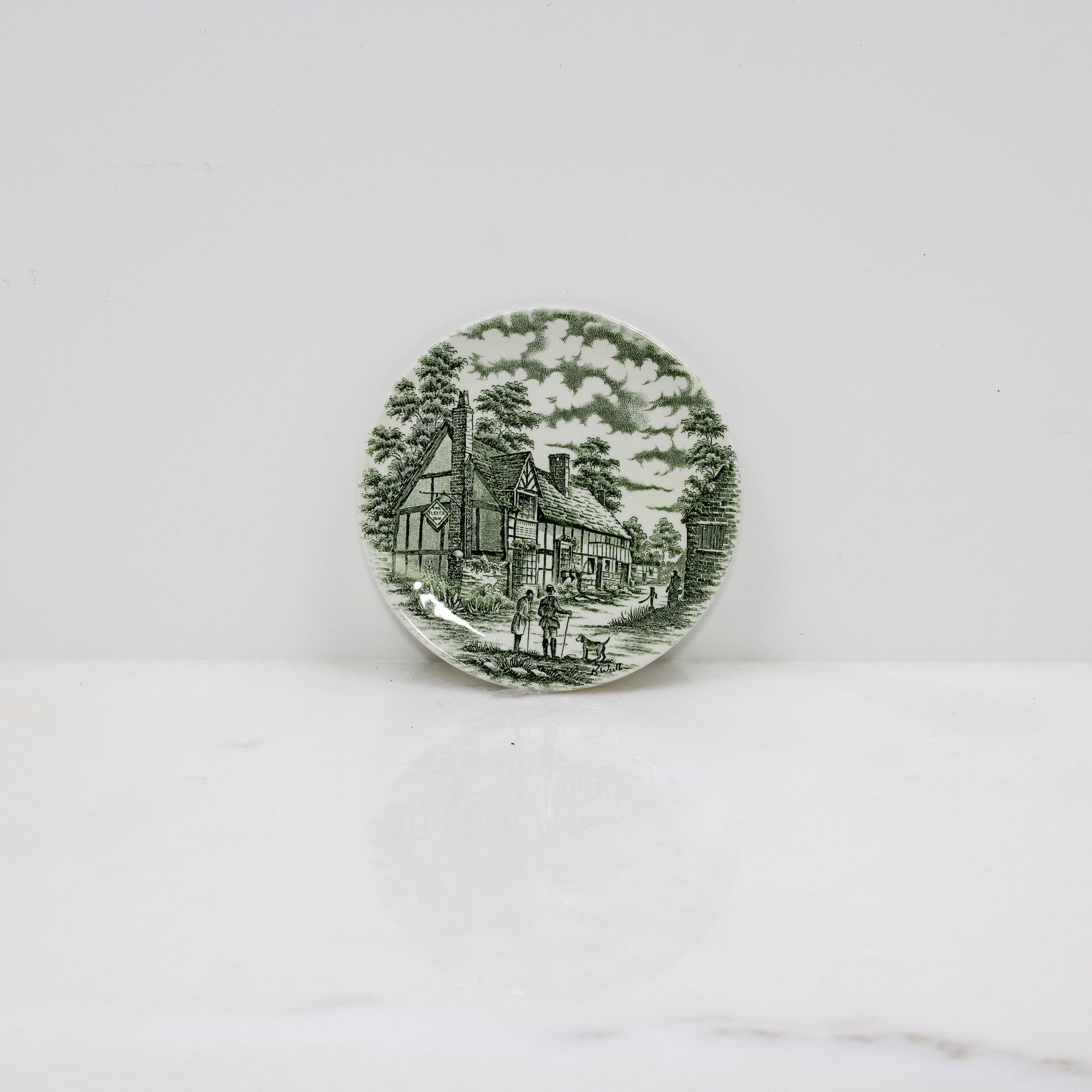 Dit specifieke patroon, dat een traditionele herberg in het Engelse platteland met ruiters en jachthonden weergeeft, staat ook bekend als de "Fleece Inn".