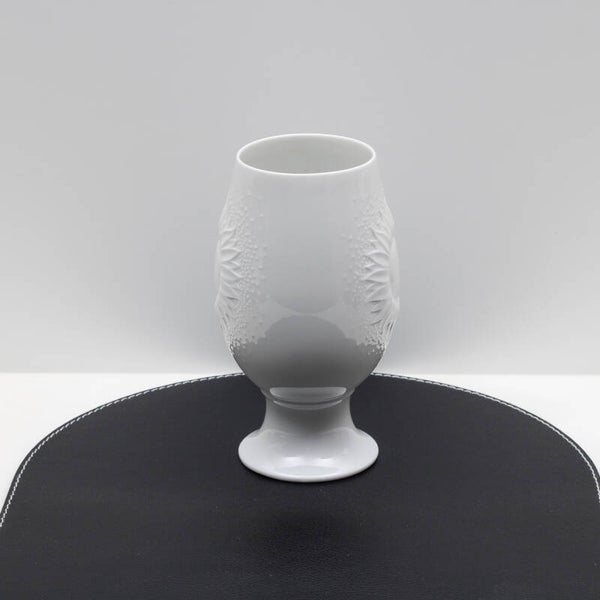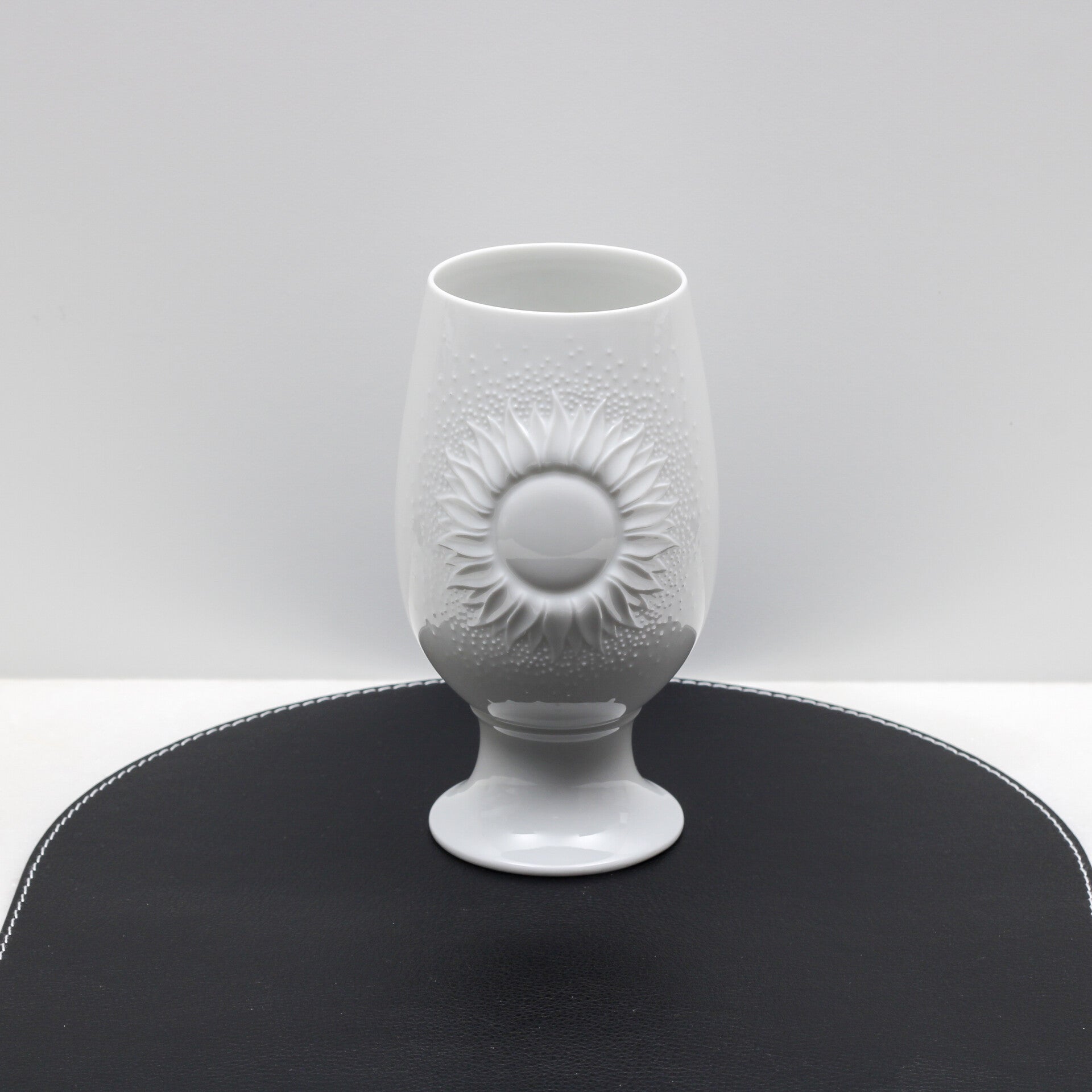 Centraal op de kelkvormige body prijkt een indrukwekkend, driedimensionaal bloemreliëf van een zonnebloem, omringd door een fijn gestippelde textuur die doet denken aan de 'Op Art'-stroming.