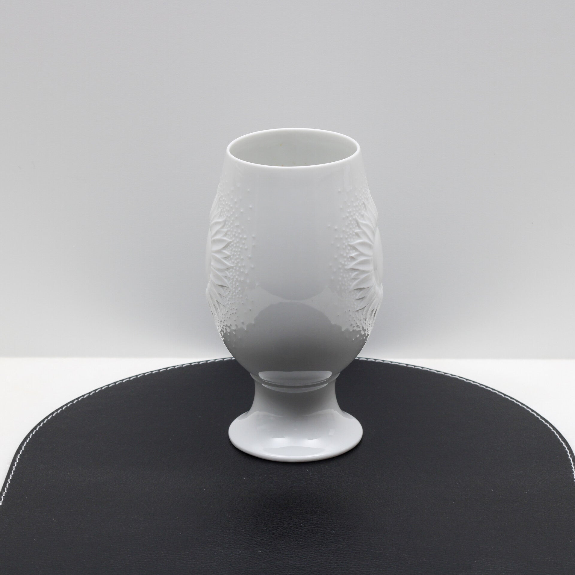 De vaas valt direct op door zijn heldere, hoogglans witte glazuur die de verfijnde details van het ontwerp extra kracht bijzet.