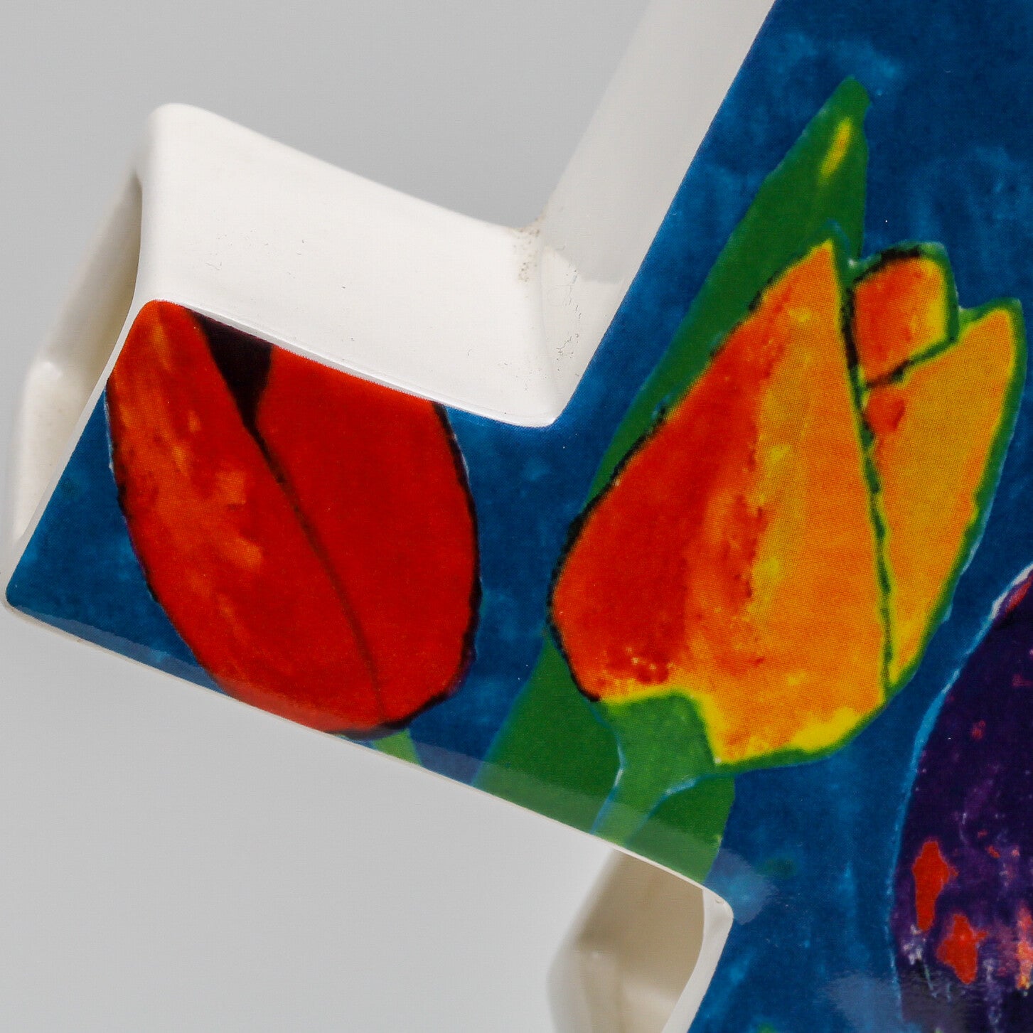 Het oppervlak fungeert als een canvas voor Lokhorst’s karakteristieke stijl: levendige, expressionistische tulpen tegen een diepblauwe achtergrond die elk modern interieur direct opvrolijken.