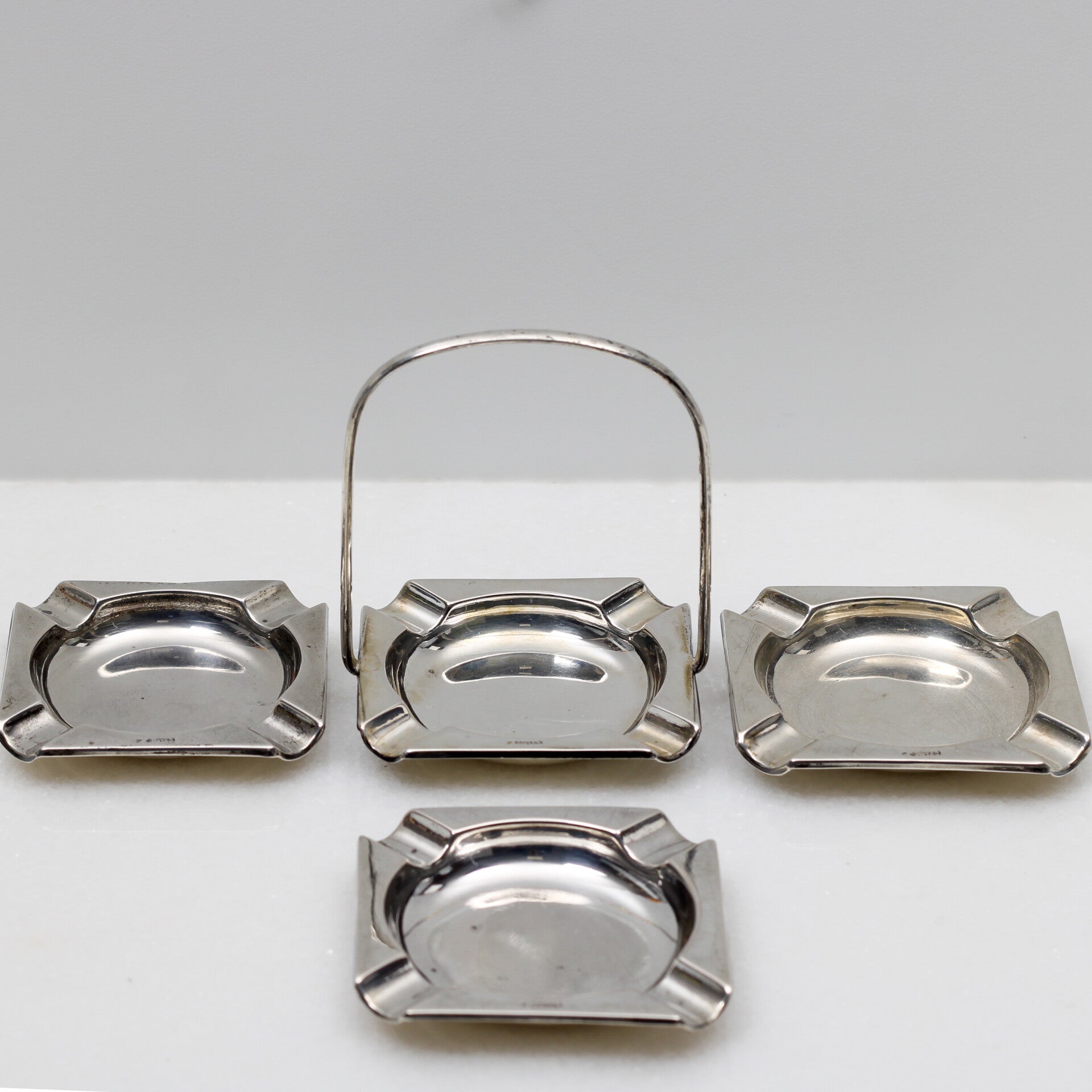 Dit ensemble is uitgevoerd in massief 835 zilver en is, samen met het bijbehorende draaghengsel, perfect voor het serveren van kleine lekkernijen of als decoratieve 'verstrooi-asbakjes' op uw salontafel.