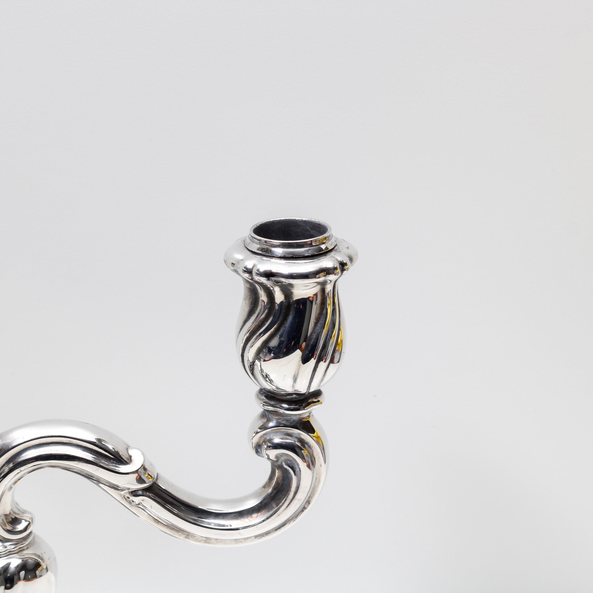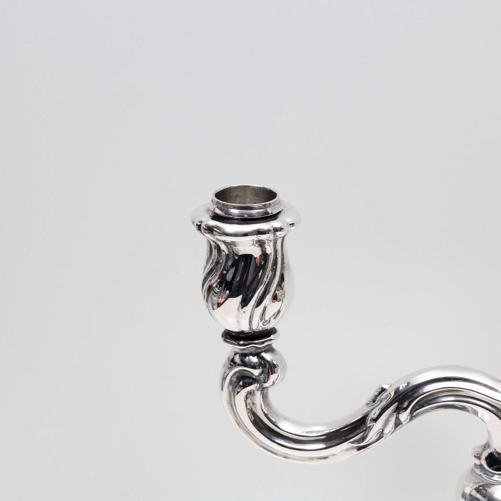 De slanke, sierlijk gebogen armen en de gegolfde details geven de kandelaar een klassieke, verfijnde uitstraling, terwijl de solide basis zorgt voor stabiliteit en allure.