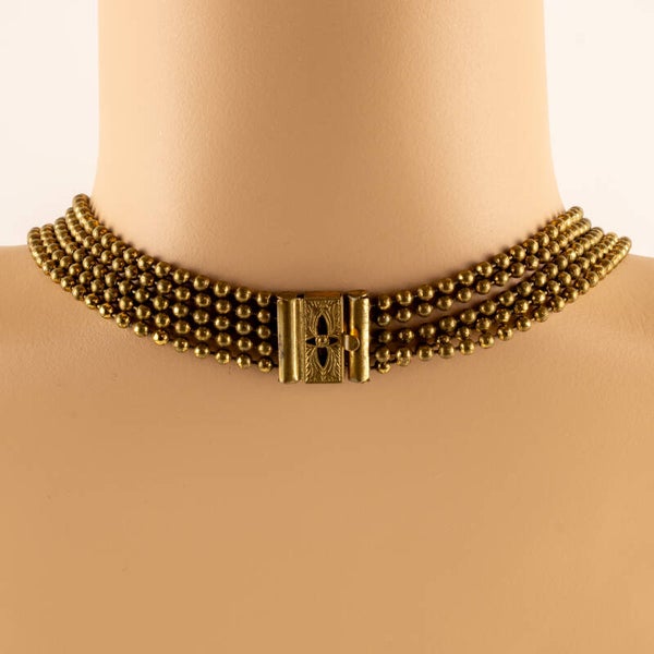 Stijl: 5-strengs ball-chain choker met gegraveerde Art Deco-sluiting.