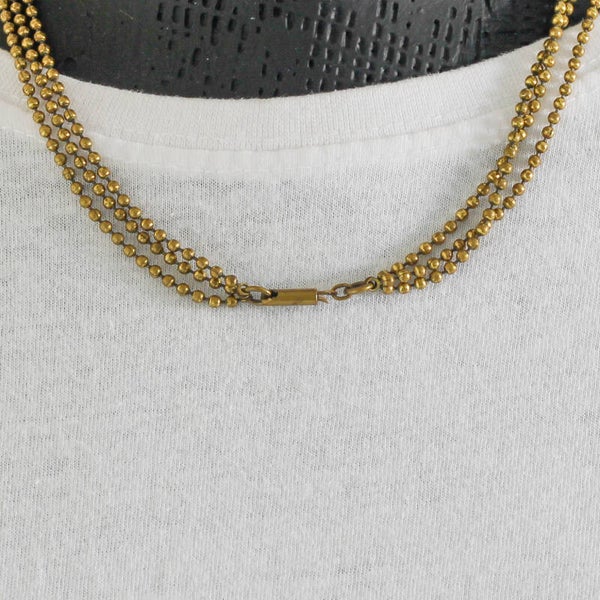 Deze elegante ketting bestaat uit drie strengen van messing kralen die prachtig gelaagd vallen.