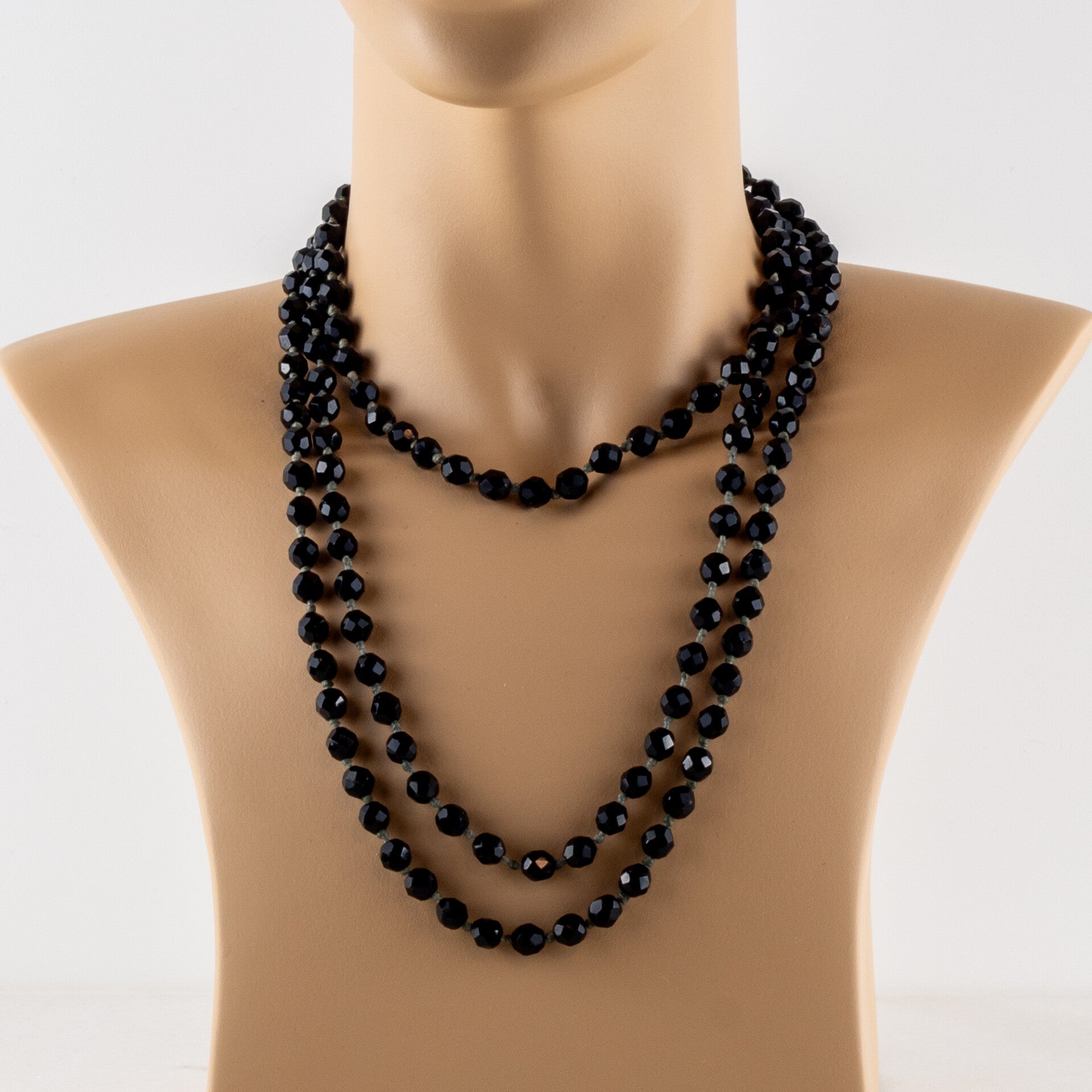 Voeg een vleugje Art Deco mystiek toe aan uw collectie met dit indrukwekkende, handgeknoopte snoer van diepzwarte onyx.