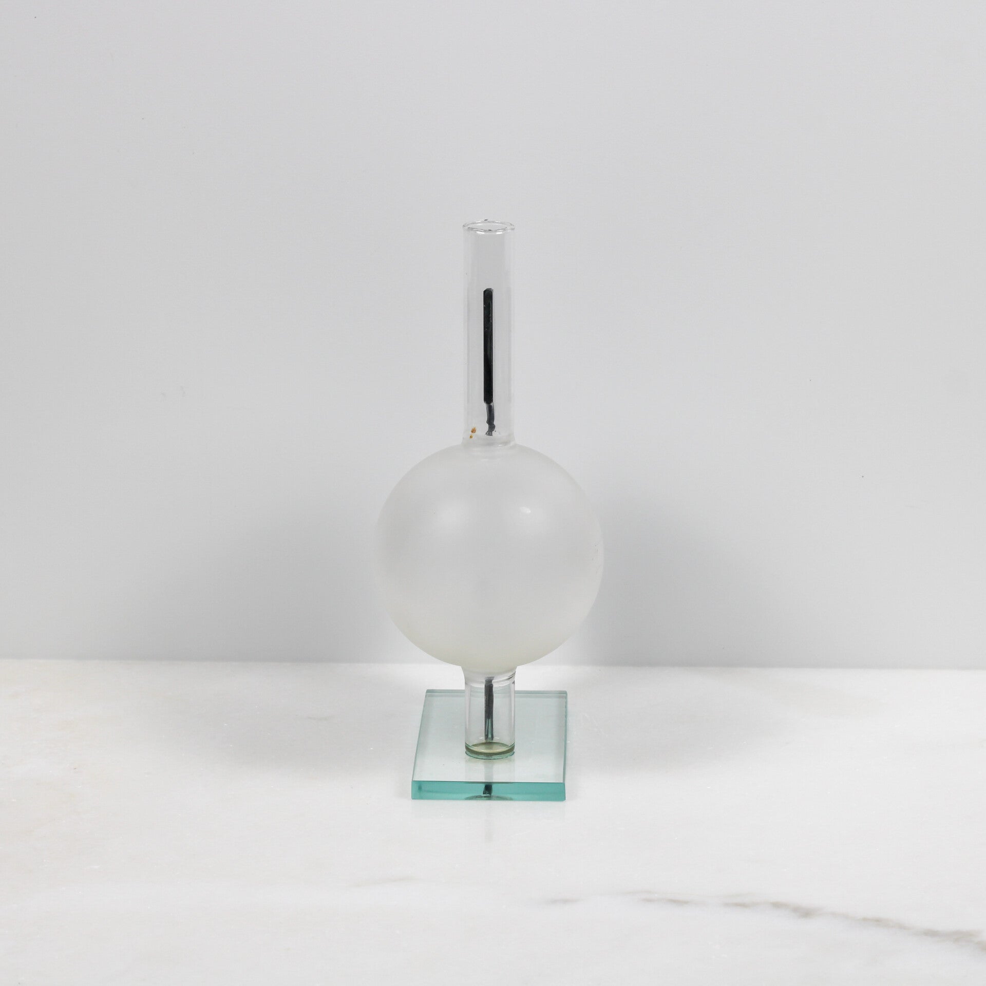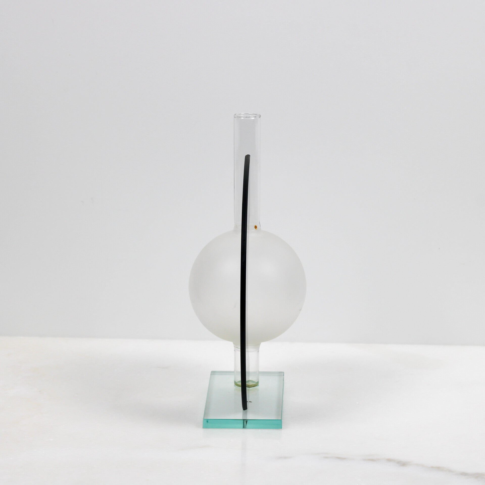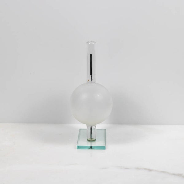 - De Basis: Een solide, transparante glazen voet die het geheel een zwevend, gewichtloos karakter geeft.
