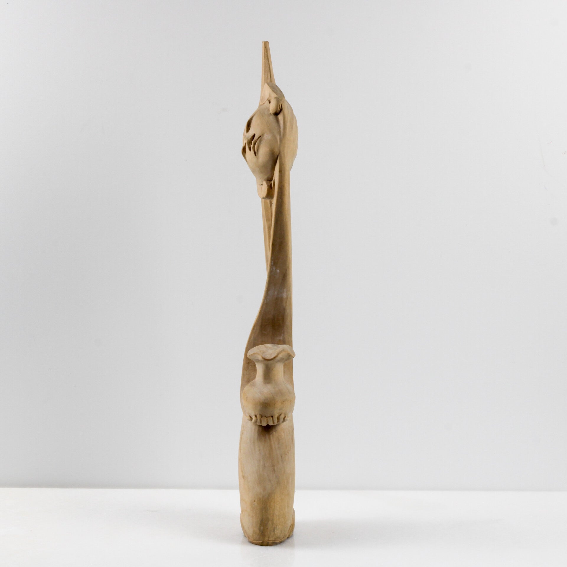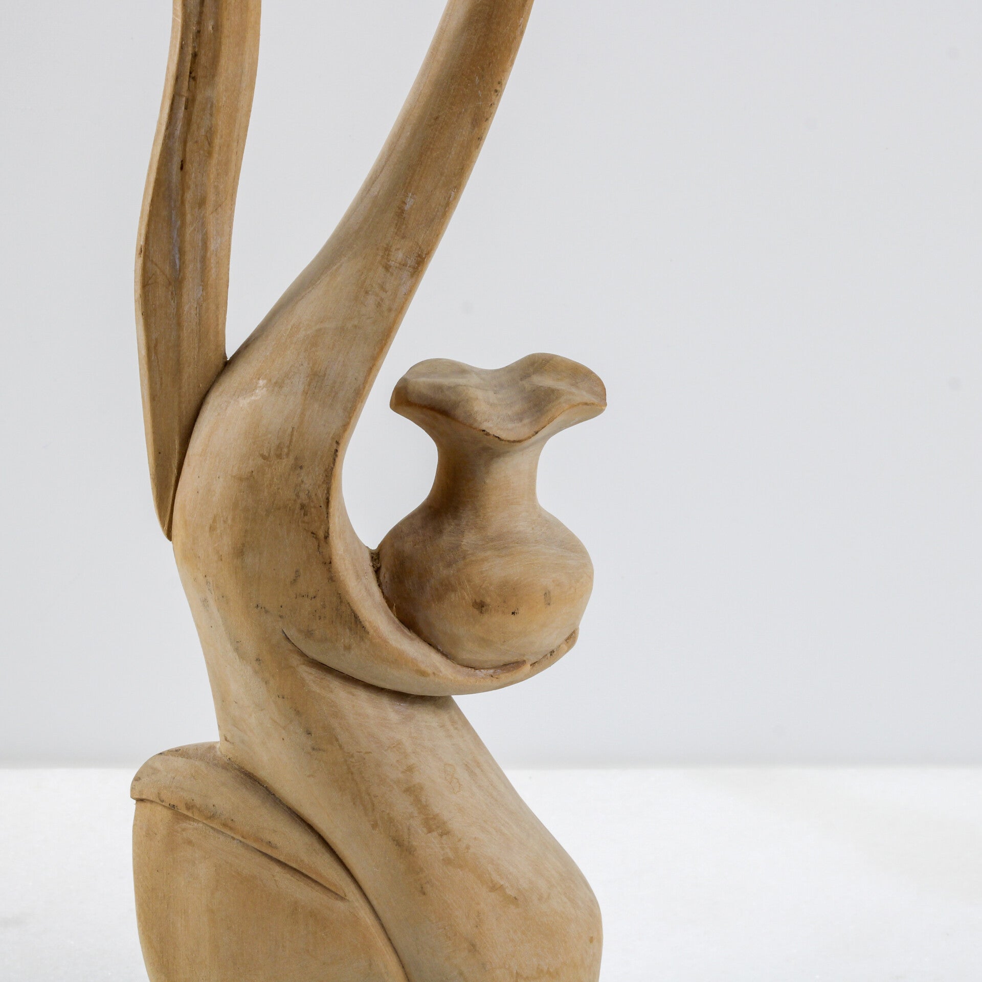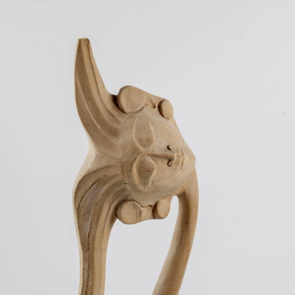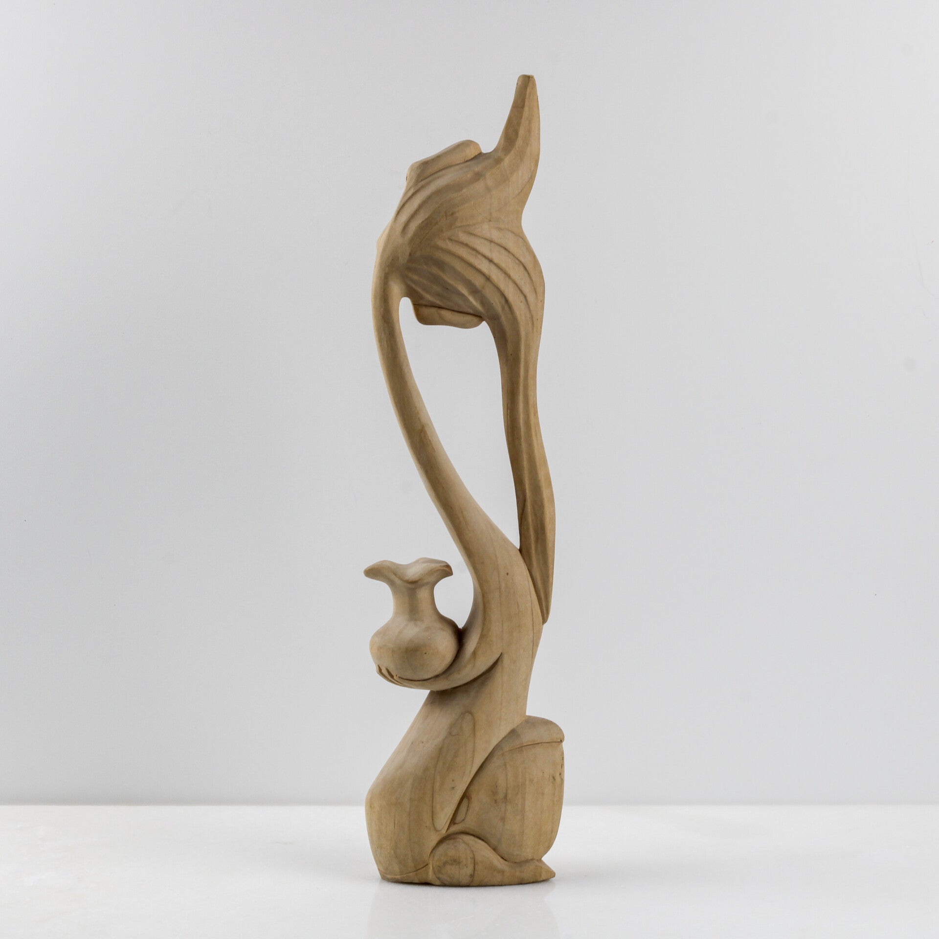 Het sculptuur is met de hand vervaardigd uit een lichte, exotische houtsoort (vermoedelijk suar- of krokodillenhout), wat de natuurlijke zachtheid van het ontwerp versterkt.