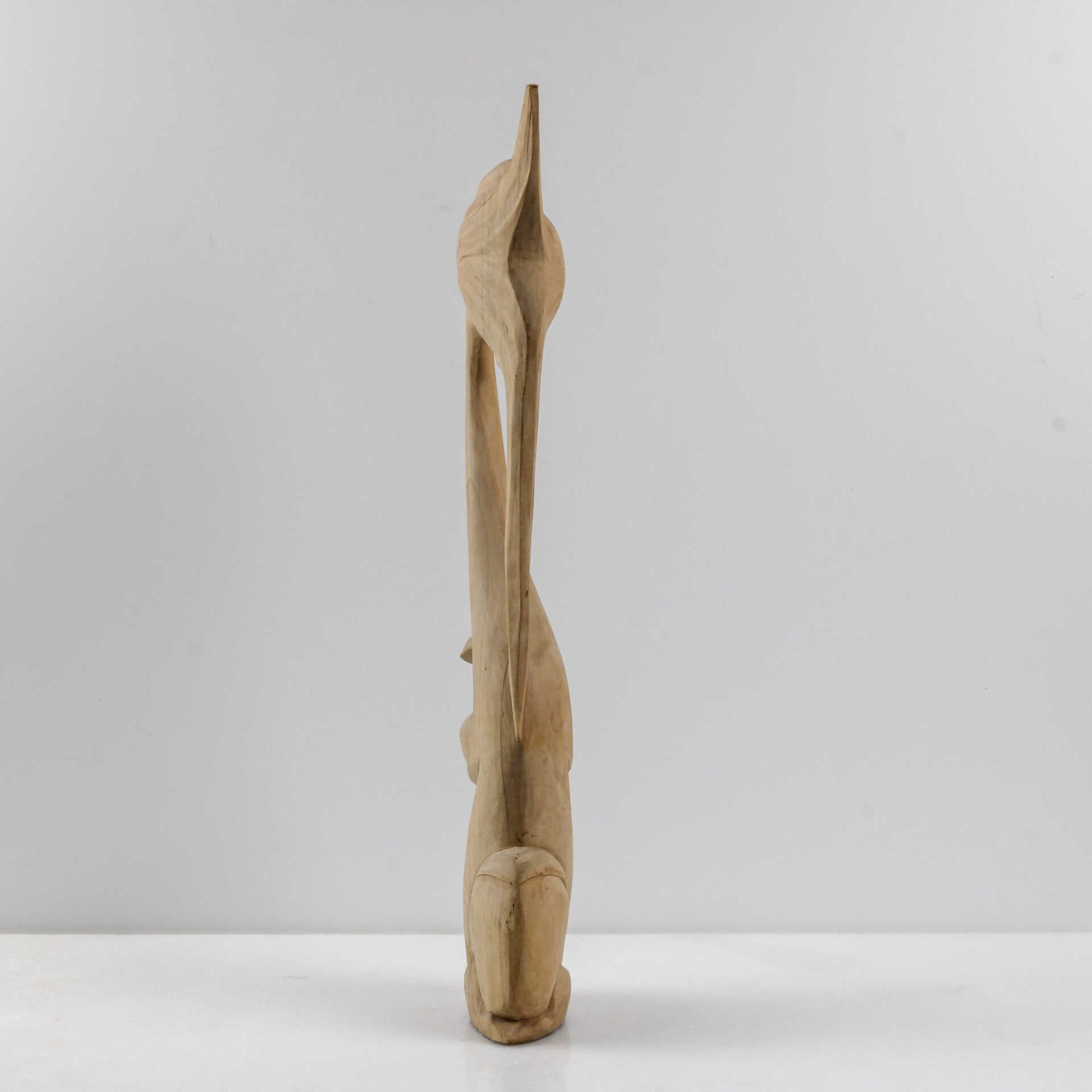 De langgerekte vormen zijn kenmerkend voor de hoogwaardige Indonesische houtsnijkunst uit de periode 1970–1980.