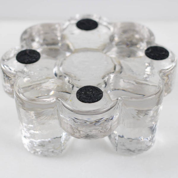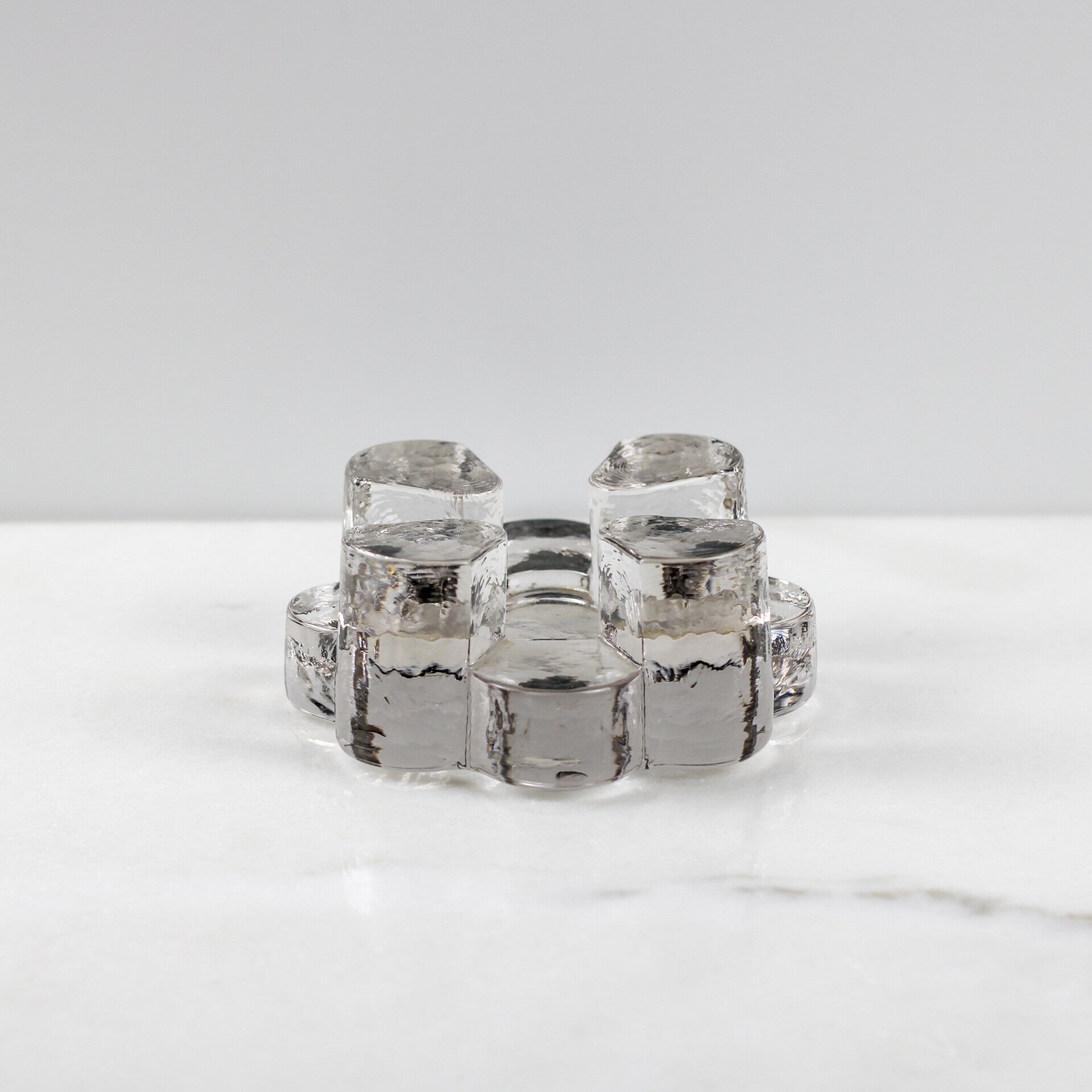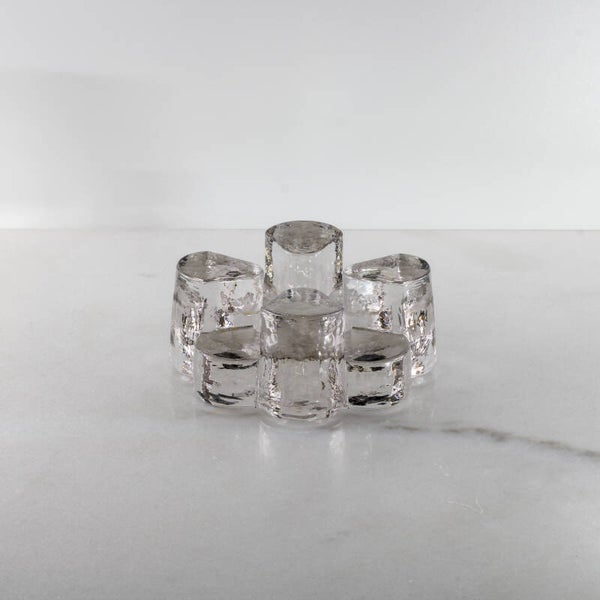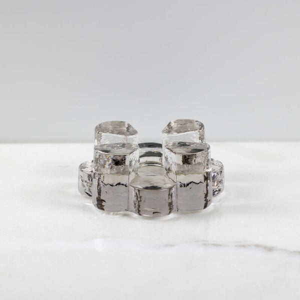 Het licht van een waxinelichtje wordt prachtig gebroken door de grillige structuur van het 'ijsglas', waardoor de rechaud ook dienstdoet als sfeervolle kandelaar.
