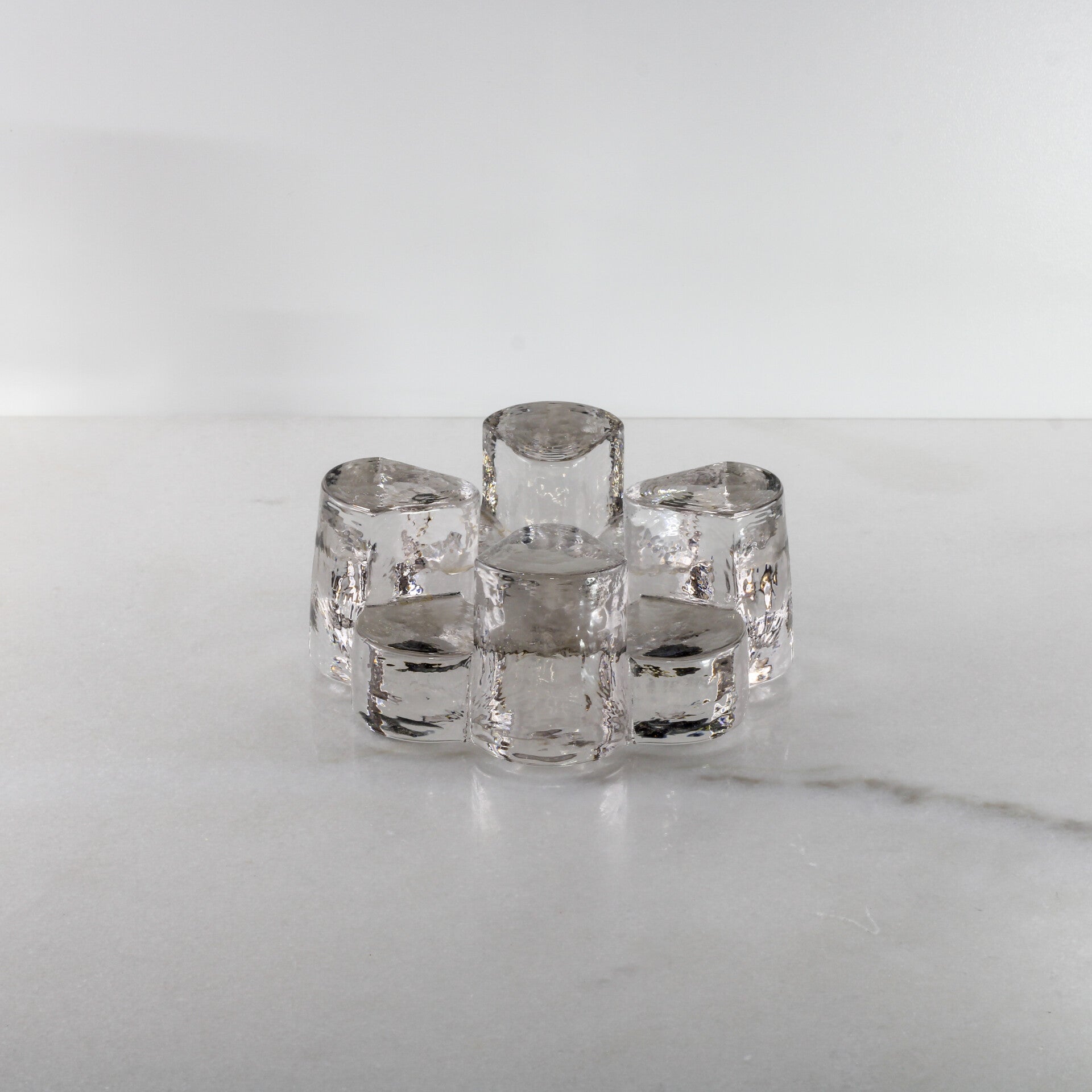 Van bovenaf bezien vormen de vijf massieve glazen staanders een elegant hartmotief.