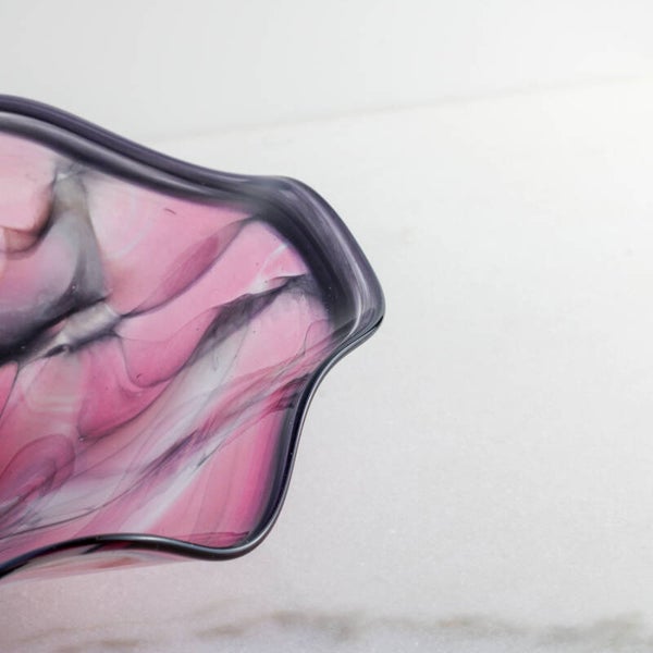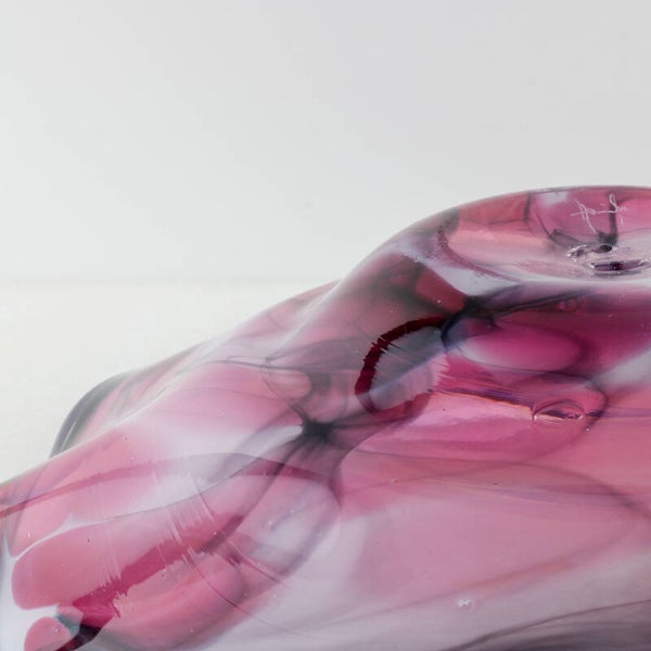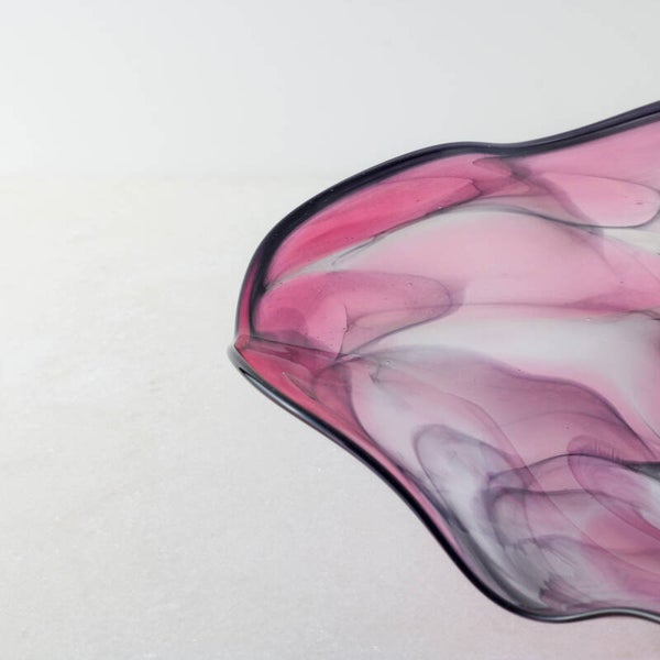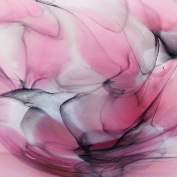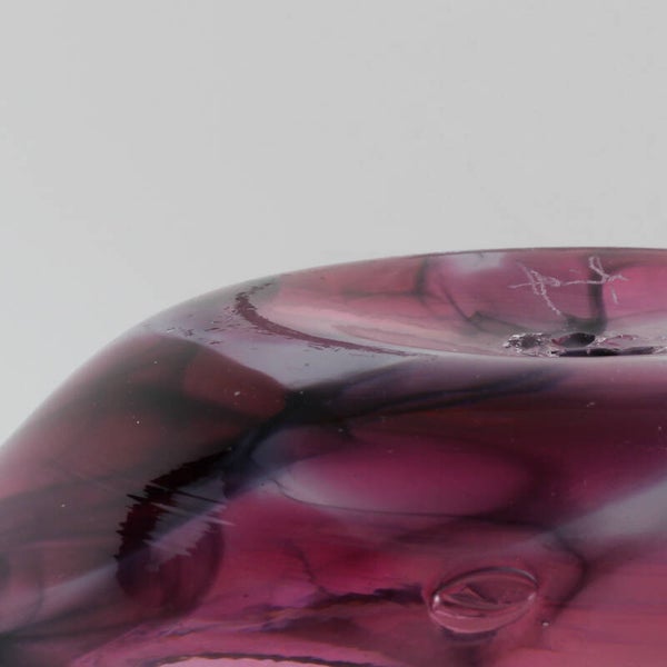 De gelaagdheid van de witte sluiers tegen de translucente paarse basis komt het best tot zijn recht op een plek waar natuurlijk licht door het glas kan spelen, waardoor de diepte van het marmerpatroon volledig wordt onthuld.