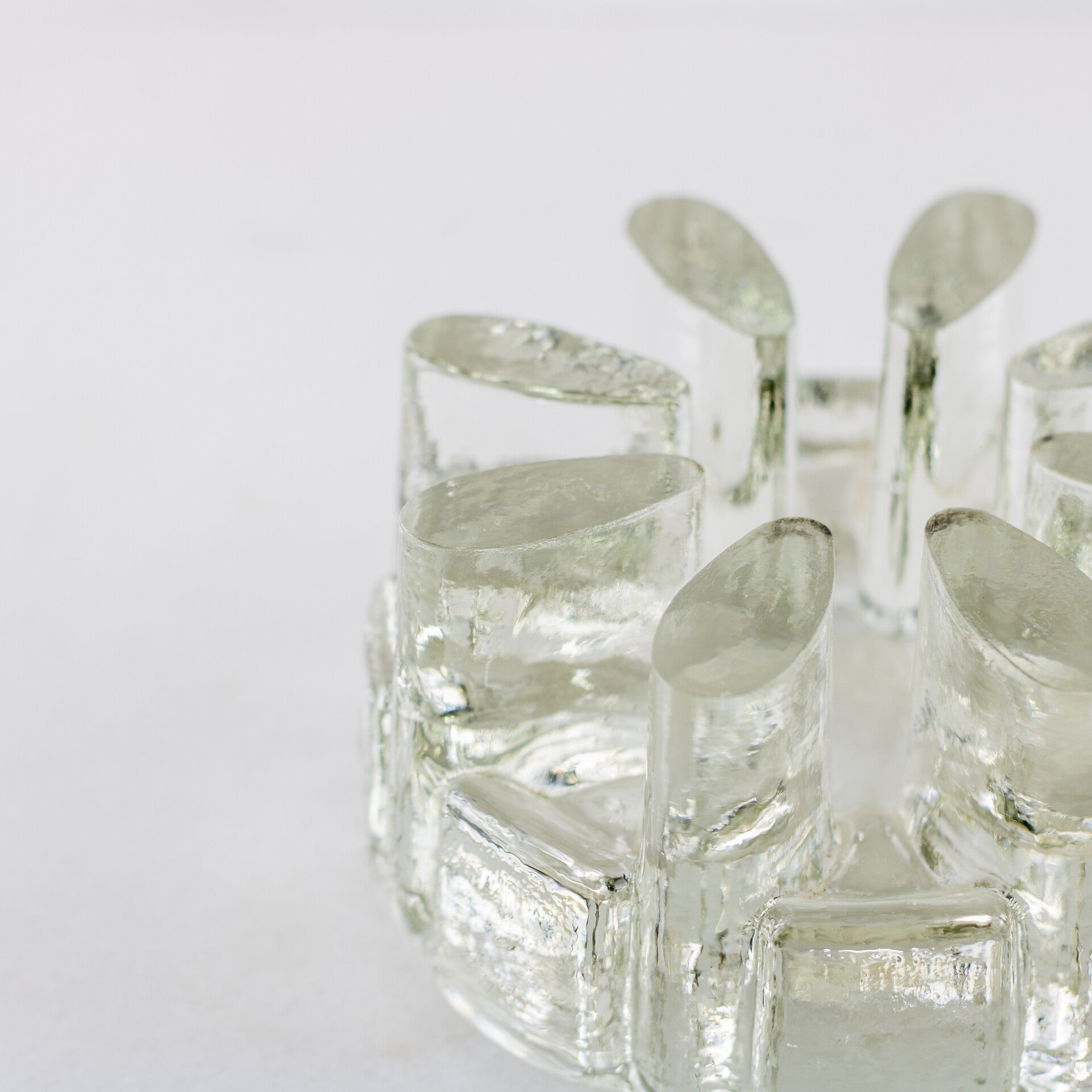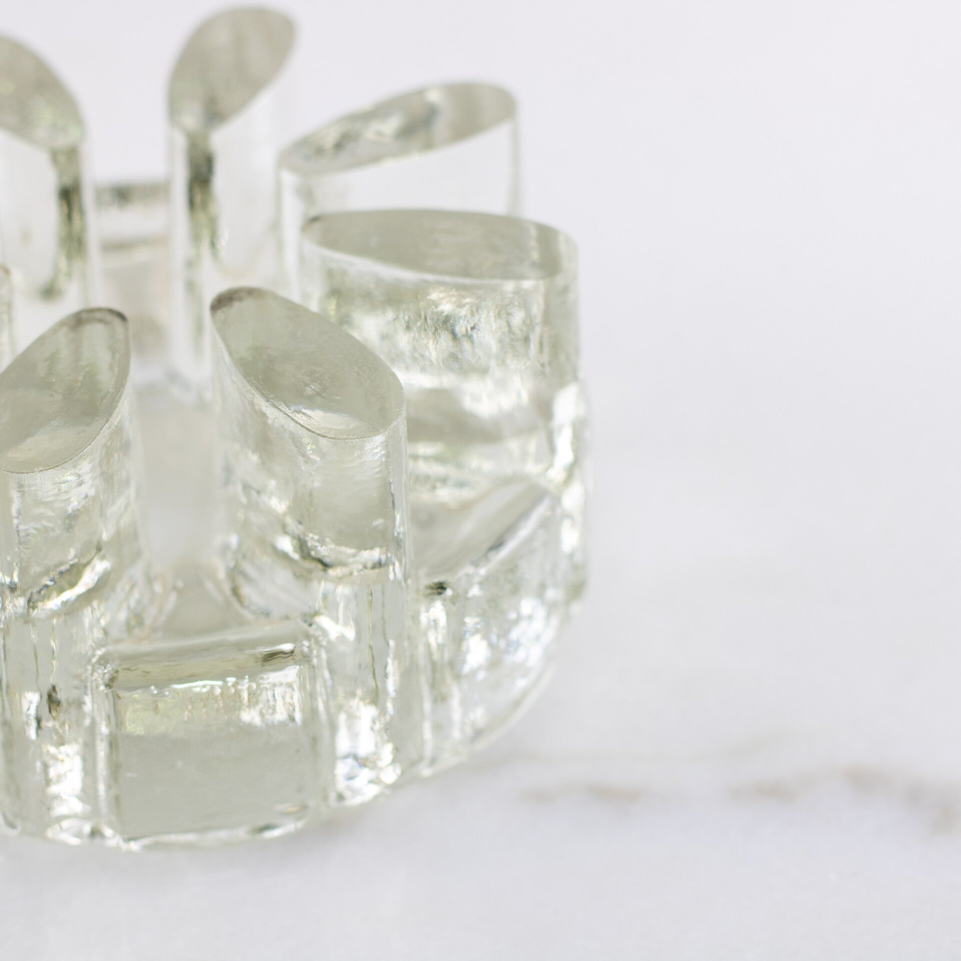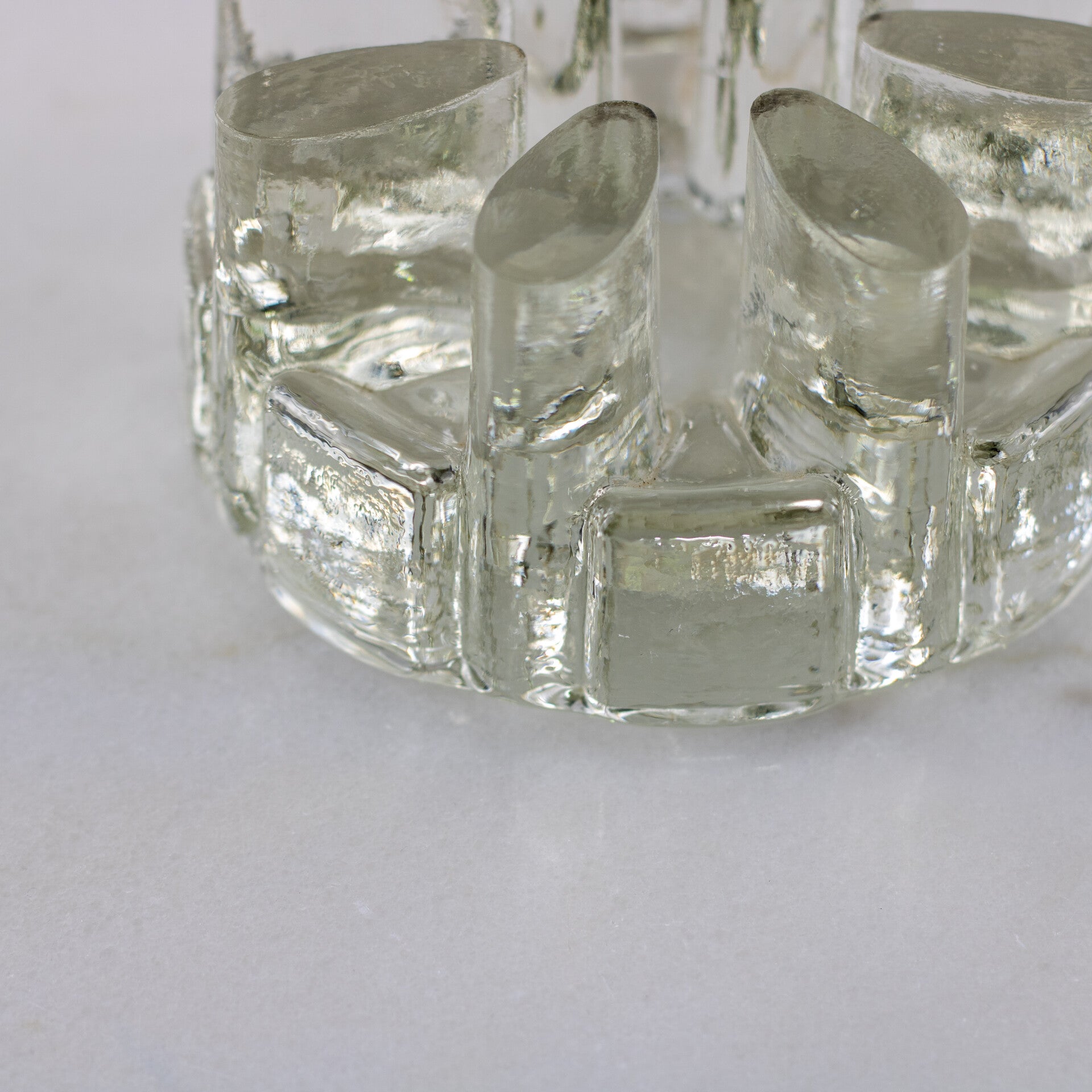Het massieve, transparante glas is gevormd met de karakteristieke "ijsglas" textuur, waardoor het licht op fascinerende wijze wordt gebroken.