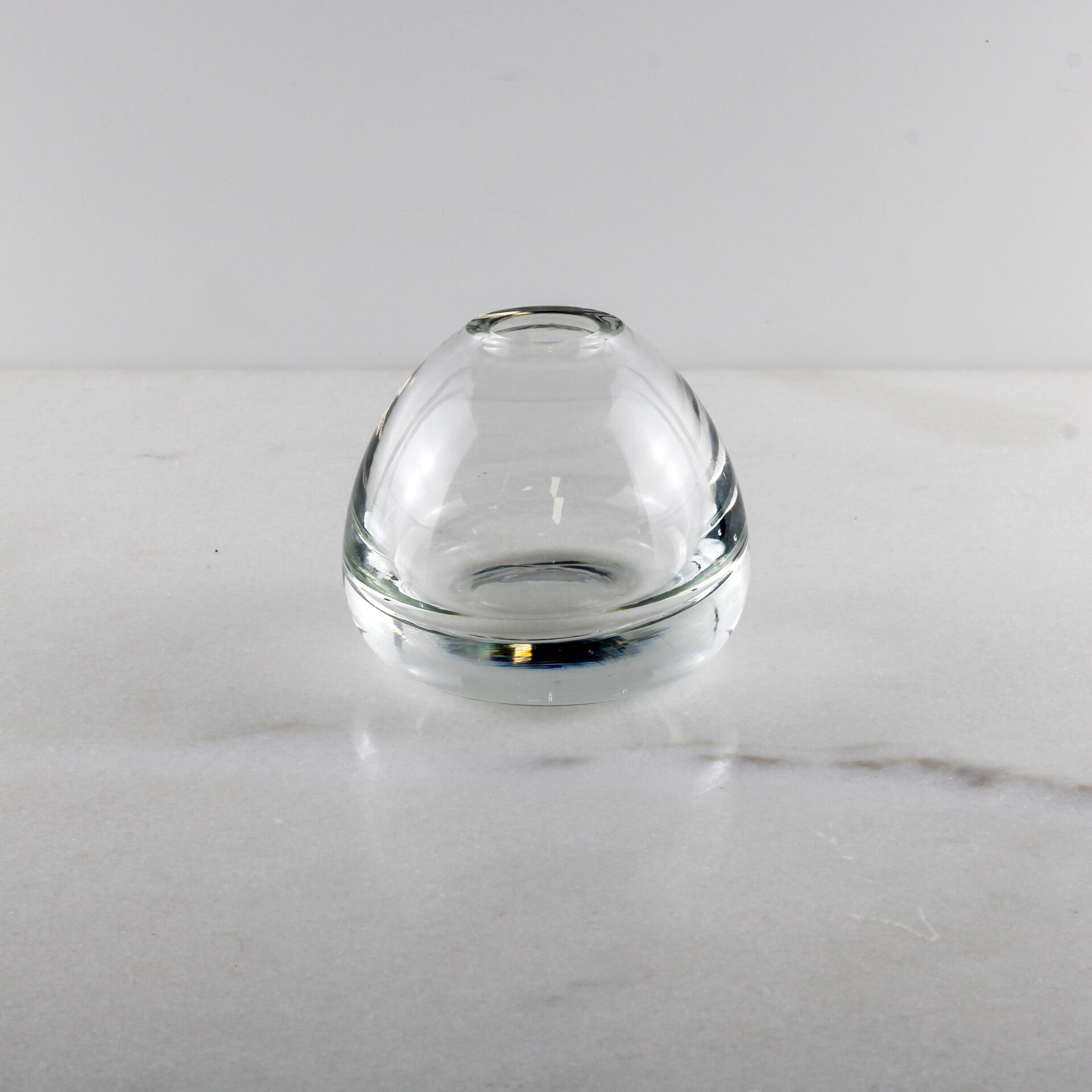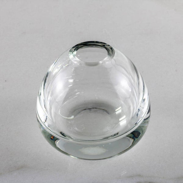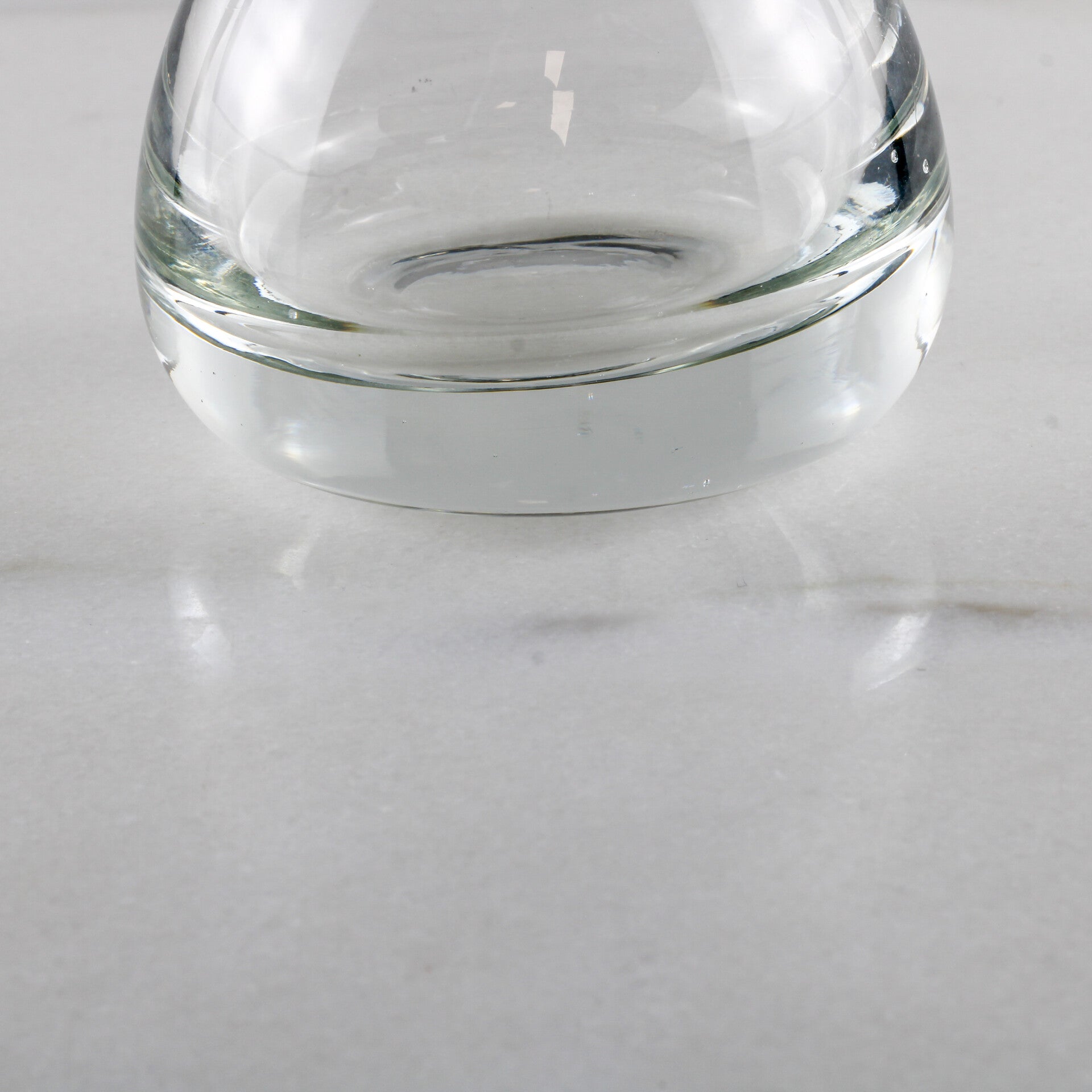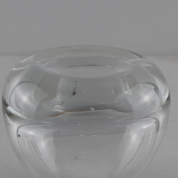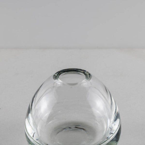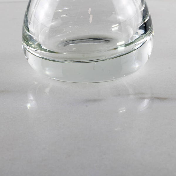 Met een gewicht van 427 gram voelt dit compacte object verrassend substantieel aan. De lichtinval in het dikwandige glas creëert een prachtig optisch spel, typerend voor de vroege ontwerpen van Copier.