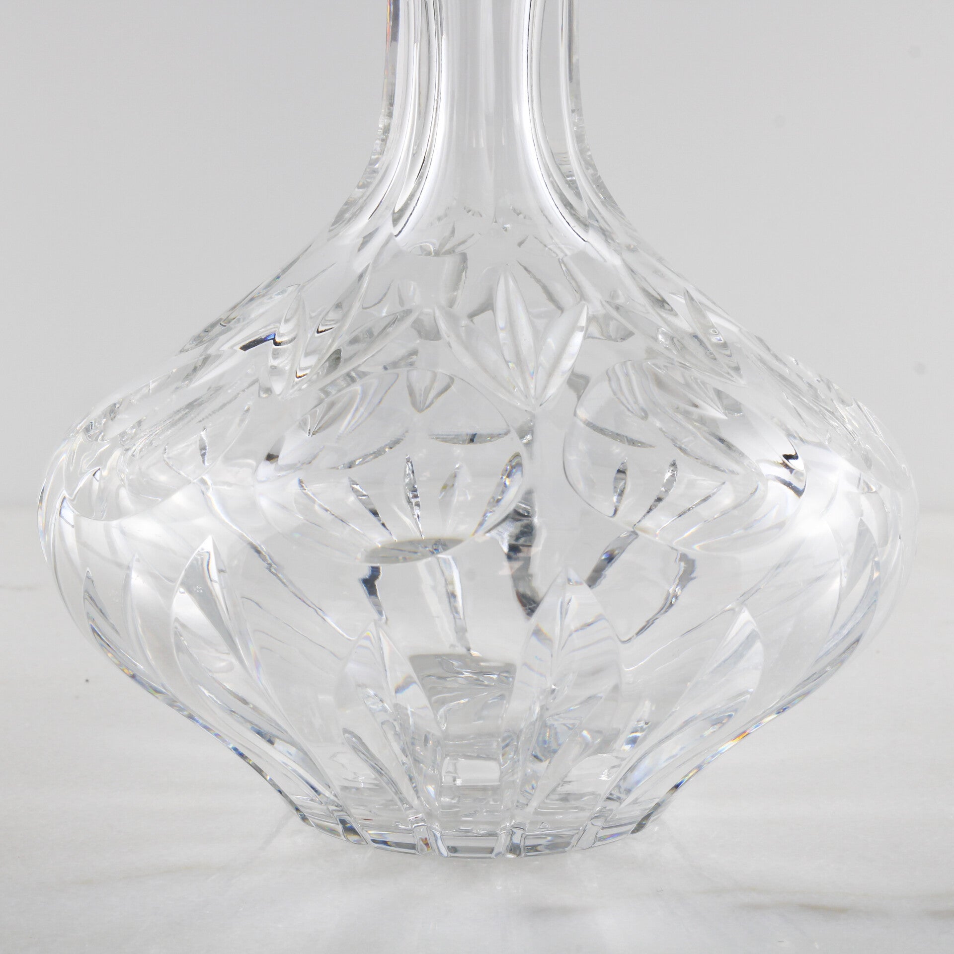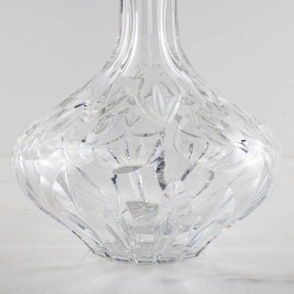 Met een indrukwekkend gewicht van 1251 gram getuigt deze karaf van een superieure kwaliteit loodkristal, uitgevoerd in een klassiek ruit- en waaierslijpsel dat het licht op fenomenale wijze breekt.