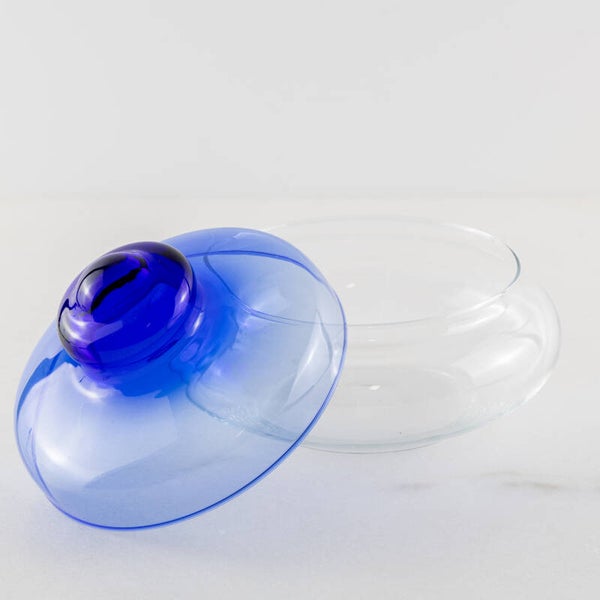 De ragfijne, mondgeblazen schaal van kristalhelder glas vormt de perfecte basis voor het pronkstuk: een deksel in diep kobaltblauw.