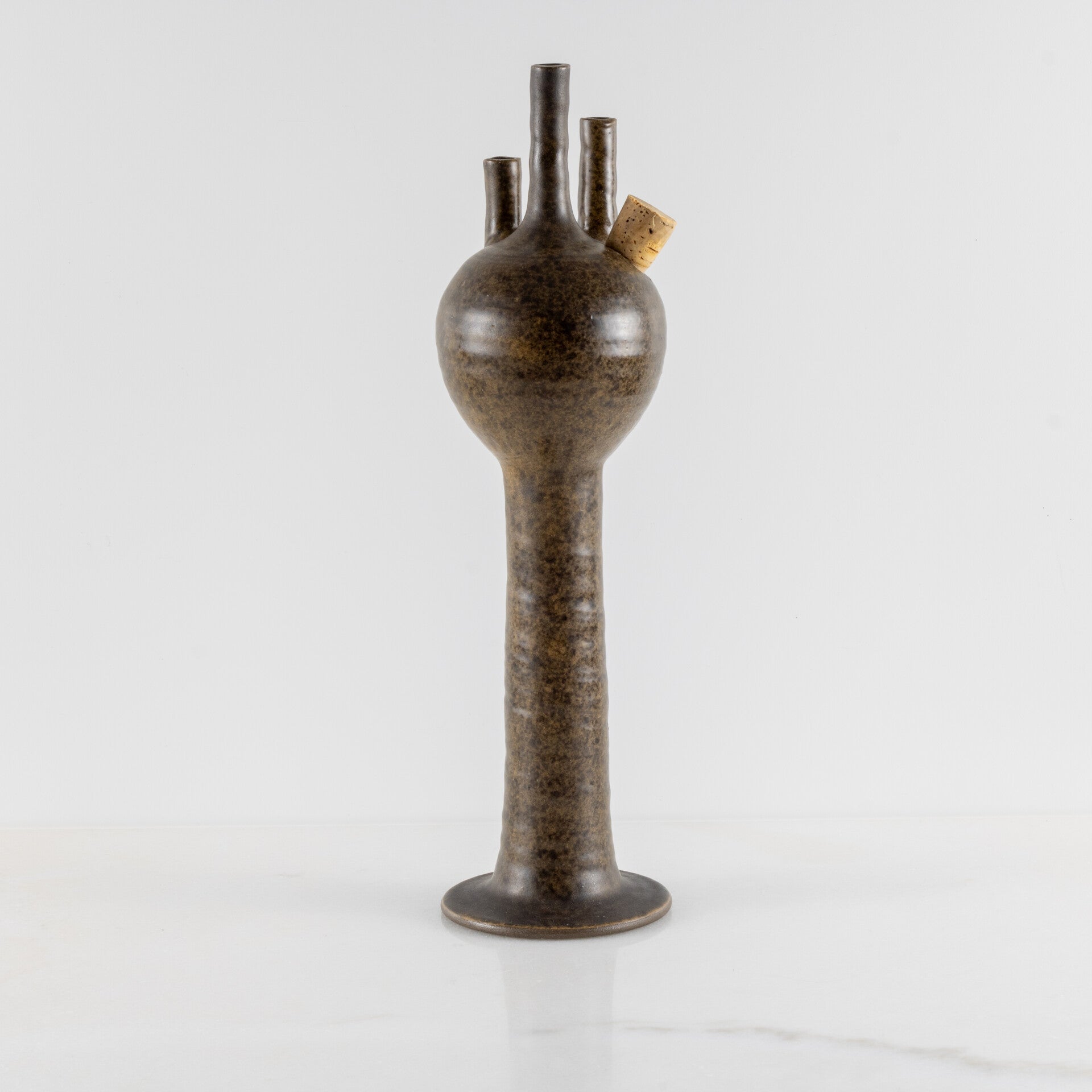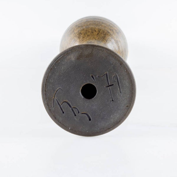 Dit stuk, vervaardigd in 1979 in zijn atelier in het Drentse Echten, belichaamt de essentie van het Nederlands studiokeramiek uit de late jaren zeventig.