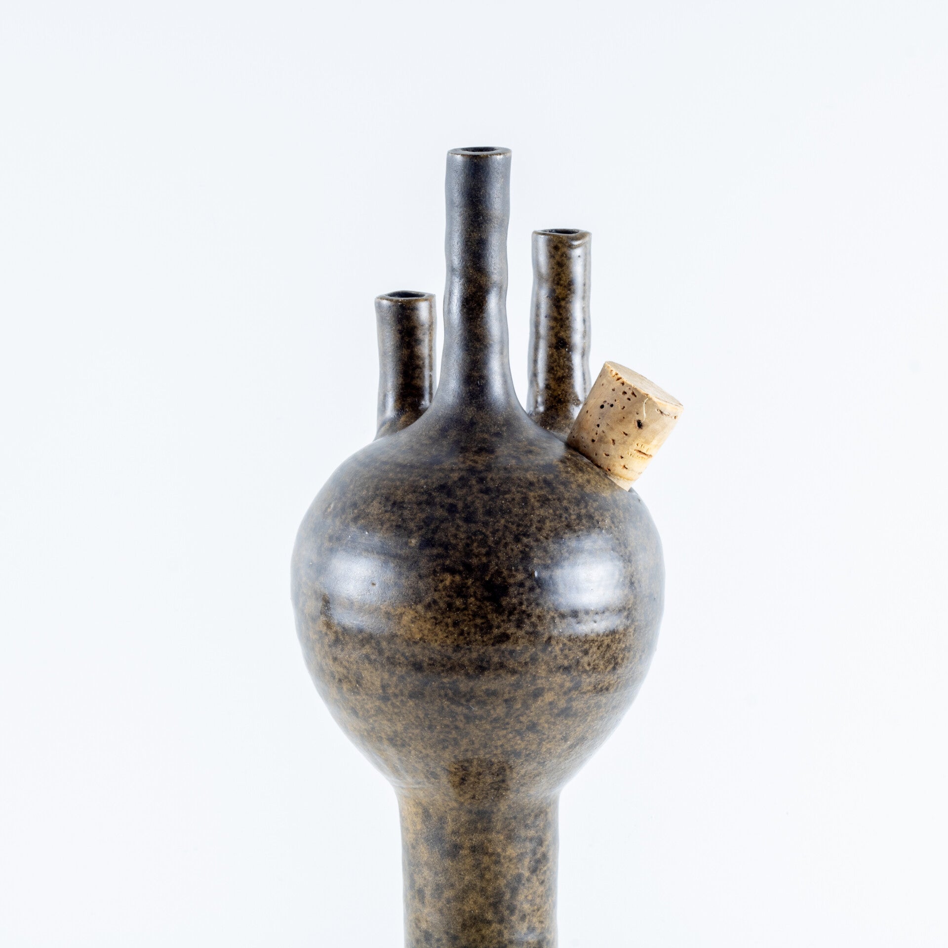 Het glazuur in diepe, gespikkelde aardetinten met een subtiele textuur geeft het object een tactiele, bijna architecturale aanwezigheid die naadloos aansluit bij een Japandi, Brutalistisch of Mid-Century Modern interieur.