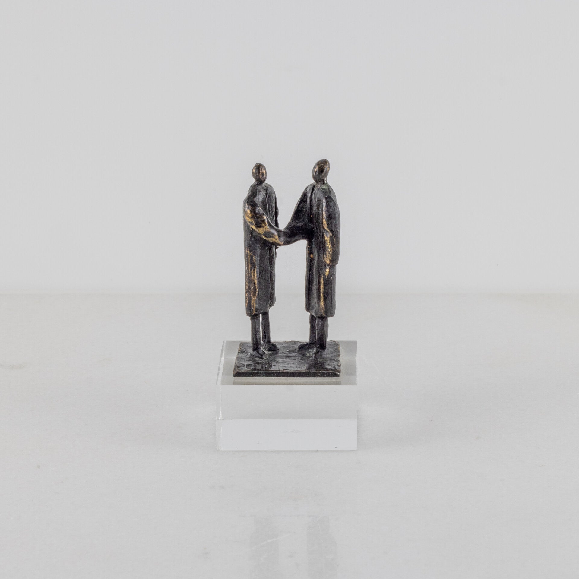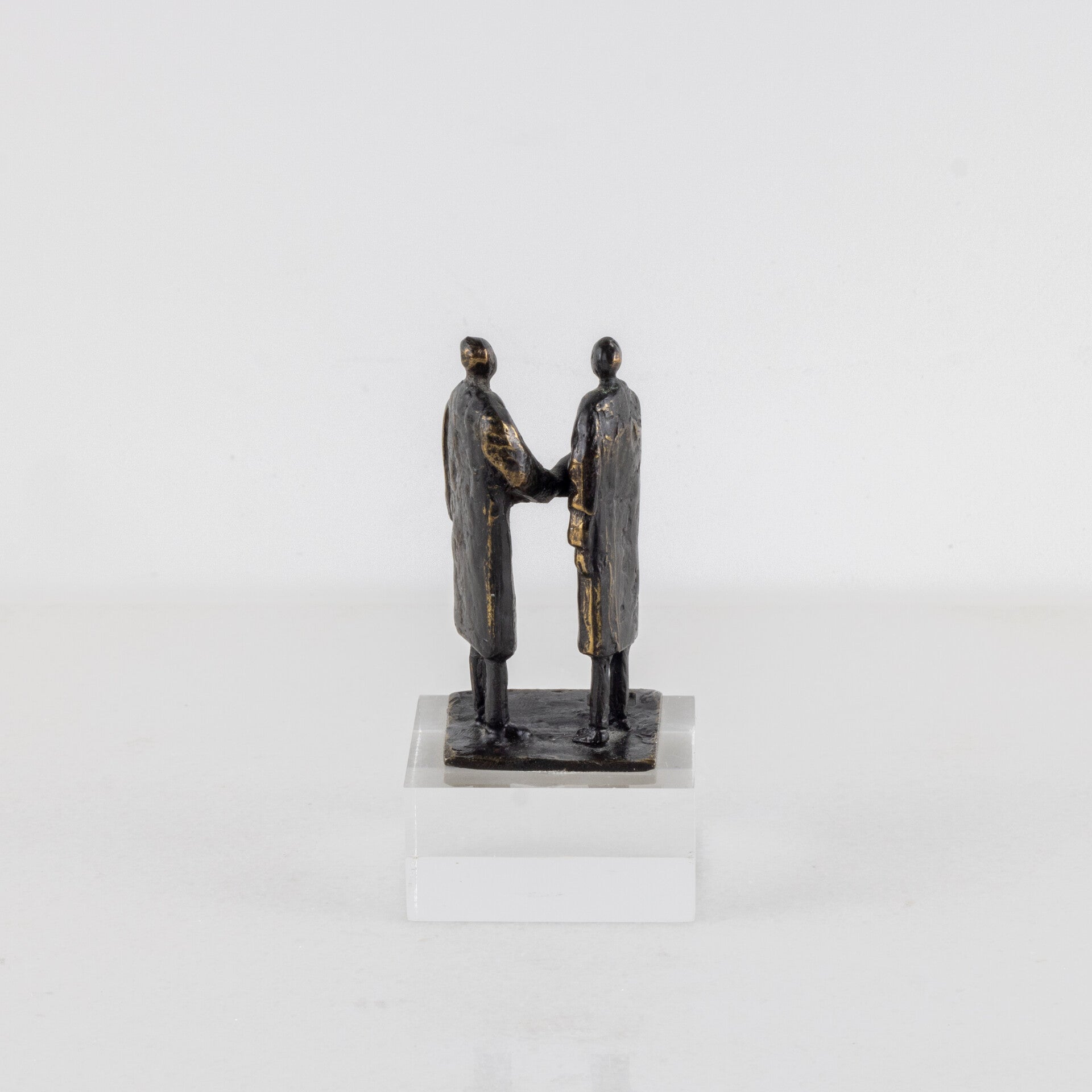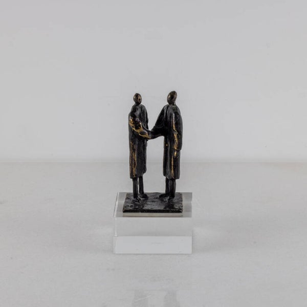 In dit specifieke werk, uitgevoerd in een hoogwaardige verbronsde tinlegering, zien we twee figuren in lange gewaden die elkaar de hand schudden.